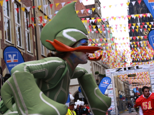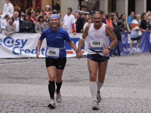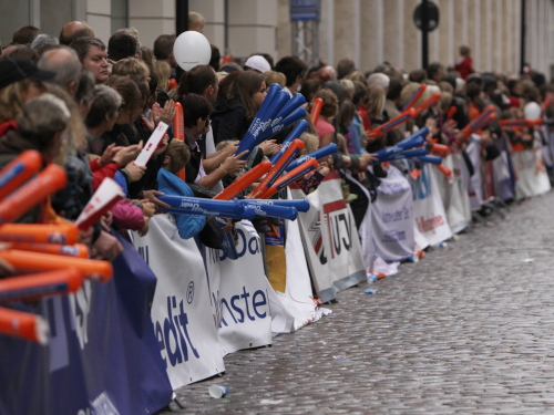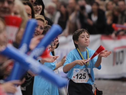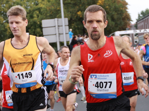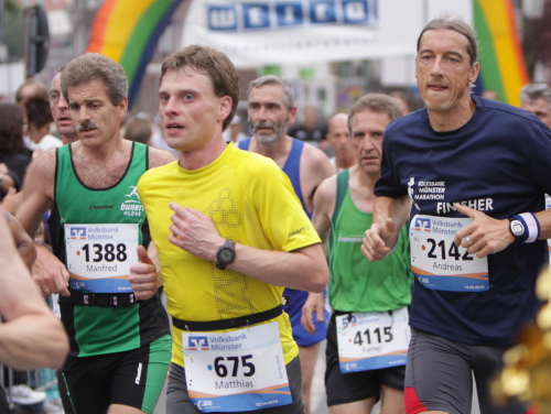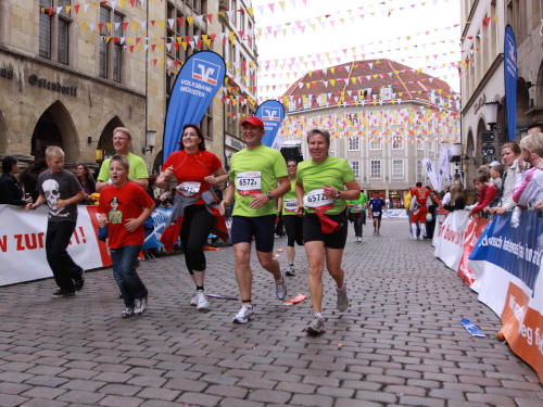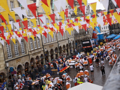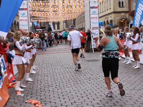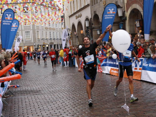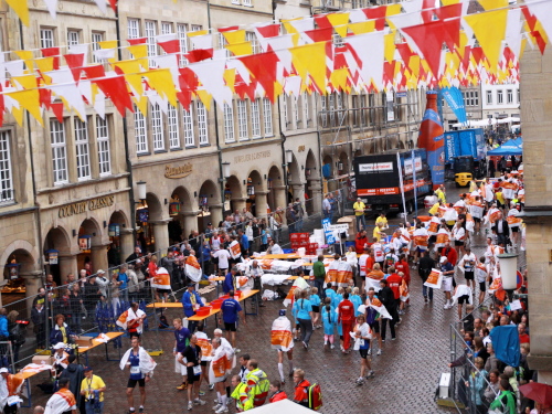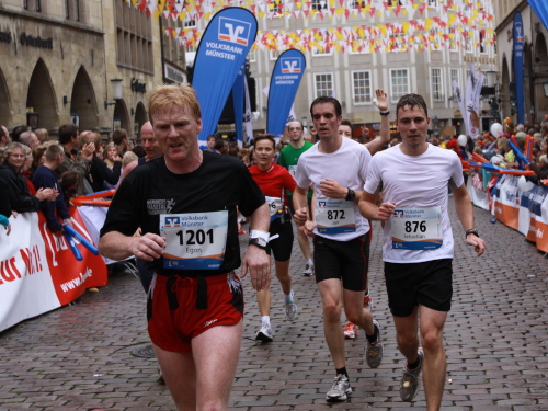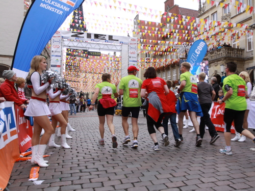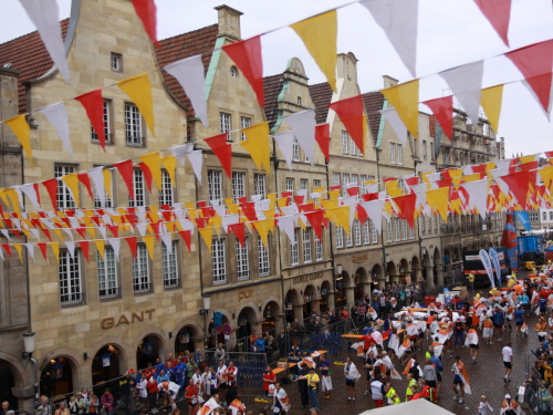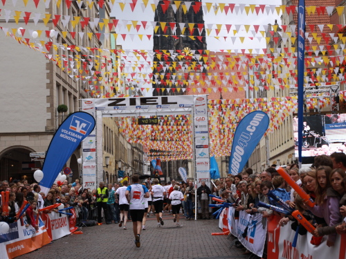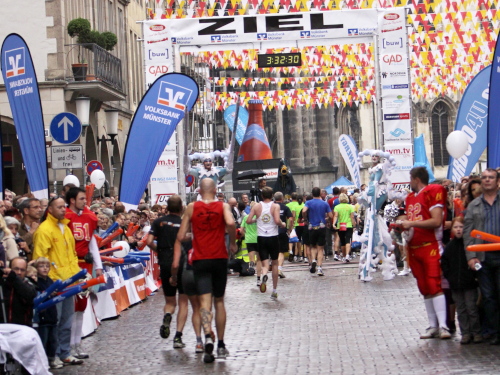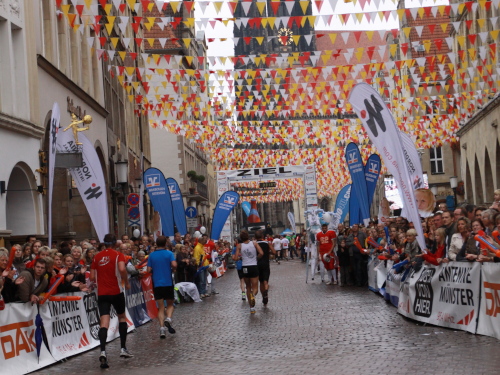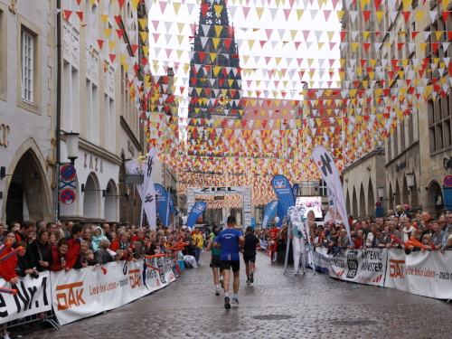 Noch 195 Meter, Prinzipalmarkt, Marathon-City, Jubelarien. Verstehe wer will, warum sie alle wie blöd rennen. Das ist doch zum Stehenbleiben, zum Hinlegen, zum Genießen.