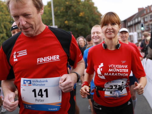 Einmal muss es sein. Ich laufe über die Matte, lasse mich mit der Medaille schmücken, nehme den Chip vom Schuh und gehe mit der Kamera dahin zurück, wo der Marathon ist, schaue in glückliche Gesichter und freue mich mit jedem Finisher. Marathon in Münster ist Feiertag, Münster ist Marathon City.