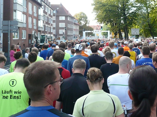 Der prämarathonale Gestank ist in Münster so allgegenwärtig wie der Duft nach ländlicher Gülle und Schweinemast. Wenn man ganz hinten im Startblock steht, dann ist man zwischen den Läufern, die noch kein Finishershirt haben. Die haben nur ein (1) Trainigsshirt und von der Erfindung des Deos noch nichts gehört. Liebe Leute! Liebe Läufer aus Münster, nächste Jahr bitte nicht wieder!