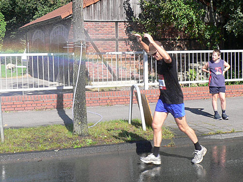 Ungefähr 3 Kilometer laufen wir jetzt durch Außenbezirke nach Gievenbeck. Gleich bei den ersten Häusern ist die Verpflegungsstelle eingerichtet. Wasser, Iso, Bananen und Orangen gibt es wie zuvor auch an jeweils separaten Tischen, alle ausreichend weit auseinander postiert, damit es kein Gedränge gibt.