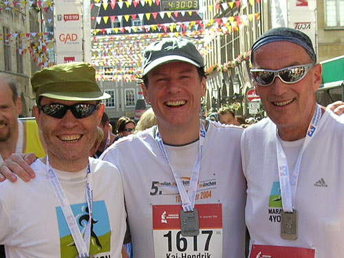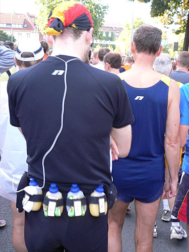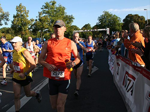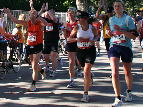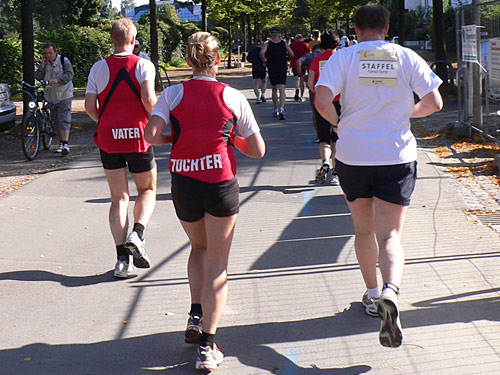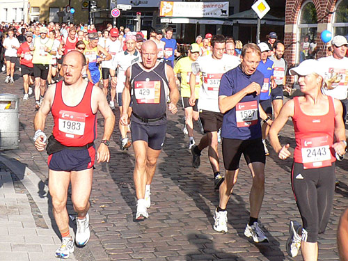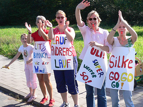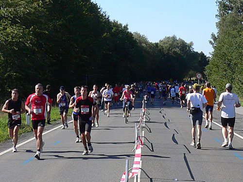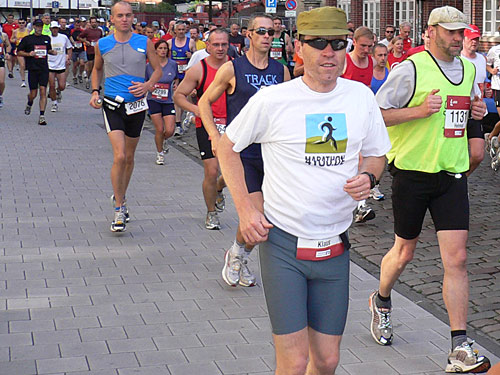 Thomas Wenning reißt mich mit lauten Rufen aus meinen Erinnerungen. Er kommt mir auf der Gegenbahn mit einer Gruppe von Läufern entgegen, die er als Pacemaker zu einer Zielzeit von 3:30 Stunden führen will. Thomas ist ein ganz extremer Läufer und ein Beispiel dafür, was man mit gezieltem Training alles erreichen kann. Ich kenne ihn schon eine ganze Weile und erinnere mich noch, wie schwer ihm ein „Doppeldecker“ mit jeweils einem Marathon am Samstag und Sonntag gefallen ist. Heute macht er extreme Etappenläufe und ist als Mitglied der Deutschen Nationalmannschaft für 24-Stunden-Läufer demnächst bei der Europameisterschaft in Verona dabei, nachdem er bereits bei der WM in Taipeh gut abgeschnitten hat. Seine Claudia ist übrigens etwas hinter mir, sie macht das Tempo für die 4:30-Läufer.