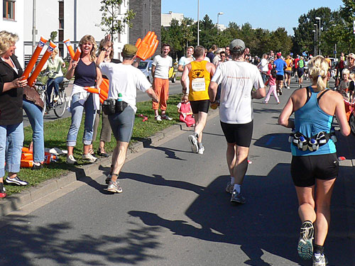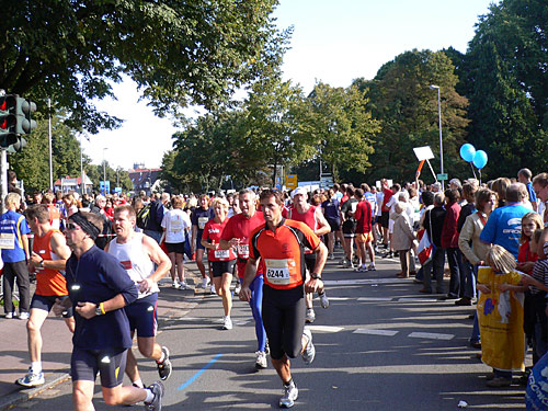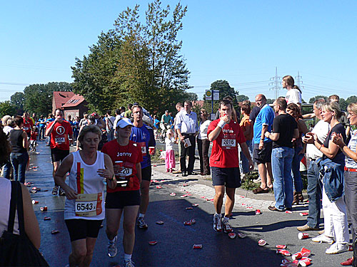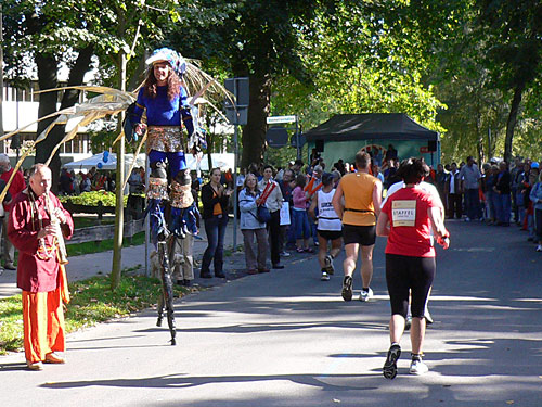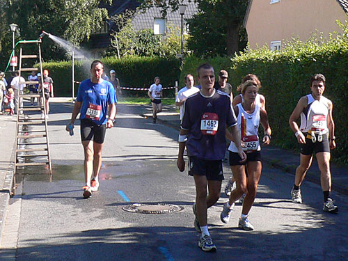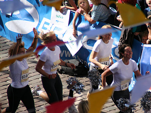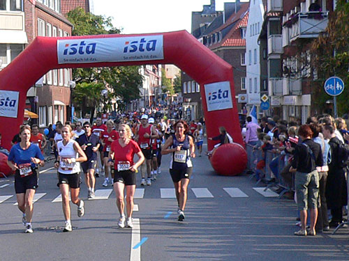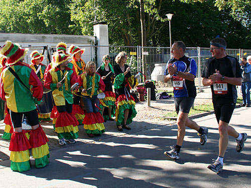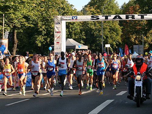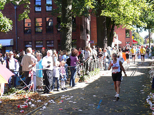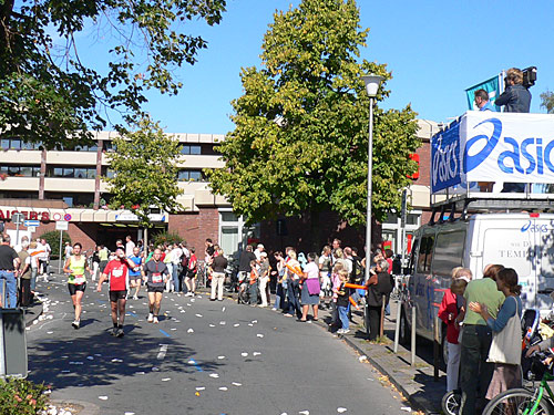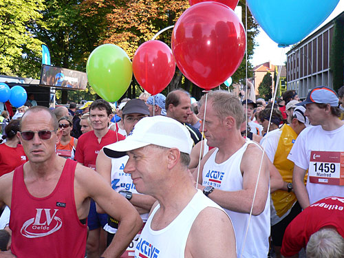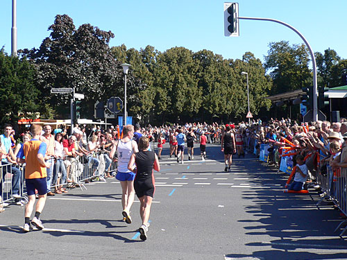 Die Strecke hat schon am Anfang viele enge Kurven, was die Eliteläufer gar nicht freuen wird, am wenigsten die, die heute den Streckenrekord knacken und die Prämie dafür einsacken wollen. Die Breitensportler weiter hinten haben damit keine Probleme, sie genießen das tolle Wetter und die phantastische Stimmung, die sich von den Zuschauern auf die Läuferinnen und Läufer überträgt.