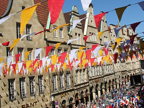 Die Läuferinnen und Läufer sind mit ihrer Vorfreude nicht alleine. Die Bevölkerung und die Stadtverwaltung stehen voll hinter „ihrem Marathon“. Die vielen tausend bunten Fähnchen, die über dem Prinzipalmarkt angebracht sind und dem Platz mit seinen historischen Gebäuden, vielen Geschäften, Cafés und Restaurants ein einmaliges Ambiente verleihen, sind da nur äußeres Zeichen.