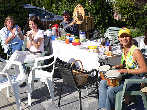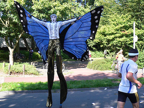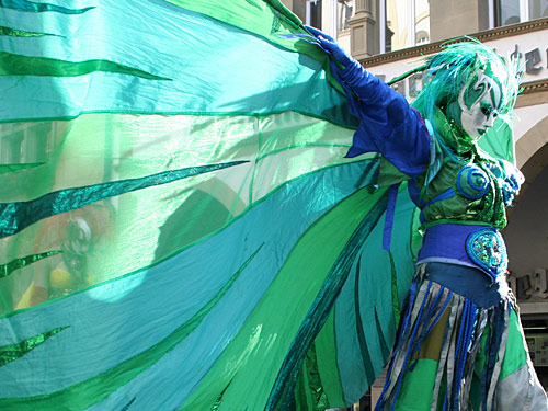 Eine besondere Attraktion sind die Stelzenläufer. War eben noch ein Paradiesvogel zu bewundern, zeigt sich jetzt der Künstler Nikhil in einem wunderbaren Schmetterlings-Kostüm. Musikalisch werden wir hier von einer "teuflisch" guten Sambagruppe begrüßt.