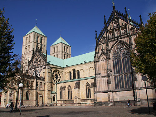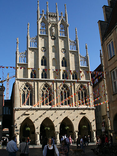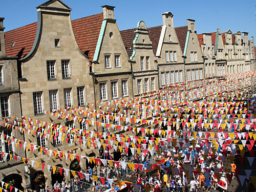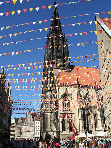 Seit dem 15. Jahrhundert sind am Prinzipalmarkt in den Häuserzeilen mit den typischen Bogengängen hauptsächlich Krämer und Kaufleute ansässig. Sehenswert sind in jedem Fall auch das gotische Rathaus, wo seinerzeit der Westfälische Frieden ausgehandelt wurde, der zum Ende des Dreißigjährigen Krieges führte und die Lambertikirche, die mit ihrem 99 Meter hohen Turm (eine Kopie übrigens des 116 Meter hohen Turmes des Freiburger Münsters) den Prinzipalmarkt nach Norden hin begrenzt. Die aus Sandstein ab 1375 erbaute Kirche wurde von Kaufleuten finanziert und war als „Gegenkirche“ zum bischöflichen Dom gedacht.