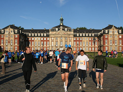 Die Startunterlagen gibt es im Freiherr-vom-Stein-Gymnasium am Hindenburgplatz. Von den großen Parkplätzen dort kommt man bequem überall hin: der Start ist direkt hier, das Ziel am Prinzipalmarkt erreicht man in ein paar Minuten. Und zum Schauen gibt es auch noch einiges. Das Fürstbischöfliche Schloss, das 1767 bis 1787 erbaute Residenzschloss für Münsters vorletzten Fürstbischof Maximilian Friedrich von Königsegg-Rothenfels, ist heute Sitz und Wahrzeichen der Westfälischen Wilhelms-Universität.