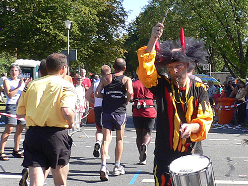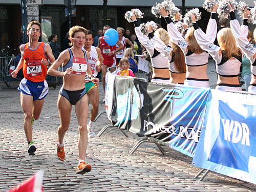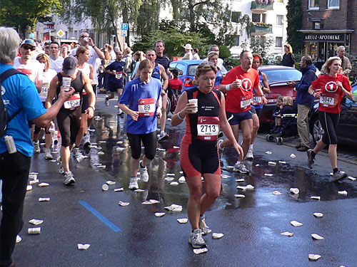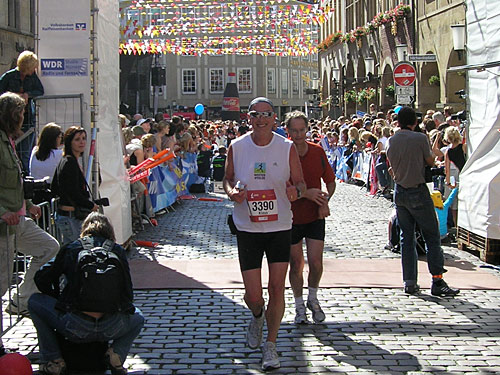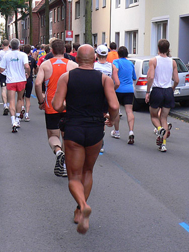 Am WDR-Power-Point am Aegiiditor tanzen Cheers zu den Rhythmen der „Marathon“-Band, wir laufen entsprechend schwungvoll links zum Aegidiimarkt und kommen auf der Neubrückenstraße ins Kreuzviertel. Der Läufer vor mir, Joachim Clerc, sucht wohl noch einen Schuhsponsor. Bis er den gefunden hat, läuft er barfuss. „Nein, so ist das nicht“, widerspricht er mir. „Ich laufe aus Überzeugung barfuss.“
