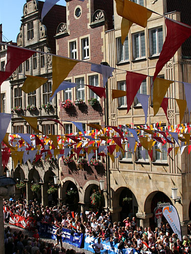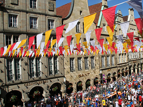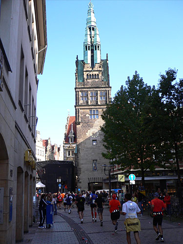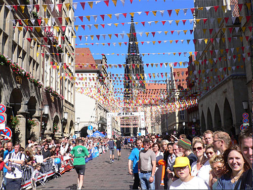 Schon am Samstag ist die Sonne nicht zu bremsen. Die Innenstadt ist sehr belebt und die vielen Straßencafés am Prinzipalmarkt sind gut besucht. Unter den Passanten sind viele, die morgen beim Marathon mitmachen. Man erkennt sie gleich an den stolz getragenen Finisher-Shirts aus aller Herren Länder und den bunten Laufschuhen. Man grüßt sich, manche kennt man, macht einen Schwatz und freut sich gemeinsam auf das Ereignis.