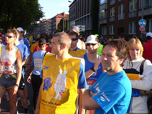 Über die Lautsprecher kommt der übliche Mix aus lauter Musik und Informationen für Läufer und Zuschauer. Langsam füllen sich die Startblocks und als alle 5.354 Läuferinnen und Läufer versammelt sind, geht es pünktlich um 9.00 Uhr los. Die erstmals ausgeschriebene Marathonstaffel ist ein riesiger Erfolg. Über 400 4er Teams haben sich angemeldet. Sie starten etwas später, damit nicht etwa einer von ihnen als Erster auf dem Prinzipalmarkt einläuft. Dieses Vergnügen soll einem „echten“ Marathoni vorbehalten sein.