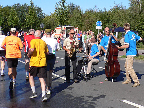 Die sonst eher störenden Staffelläufer fallen hier kaum auf. Die meisten haben auch nur Spaß im Sinn und wollen einmal Marathonluft schnuppern. Und davon gibt es in Münster reichlich, das kann ich jetzt schon sagen. Bei km 7,5 haben wir schon den dritten Power-Point, es spielen „Fisherman’s friends“ und am Mikrofon kommentiert Werner Driese das Geschehen.