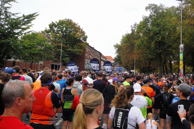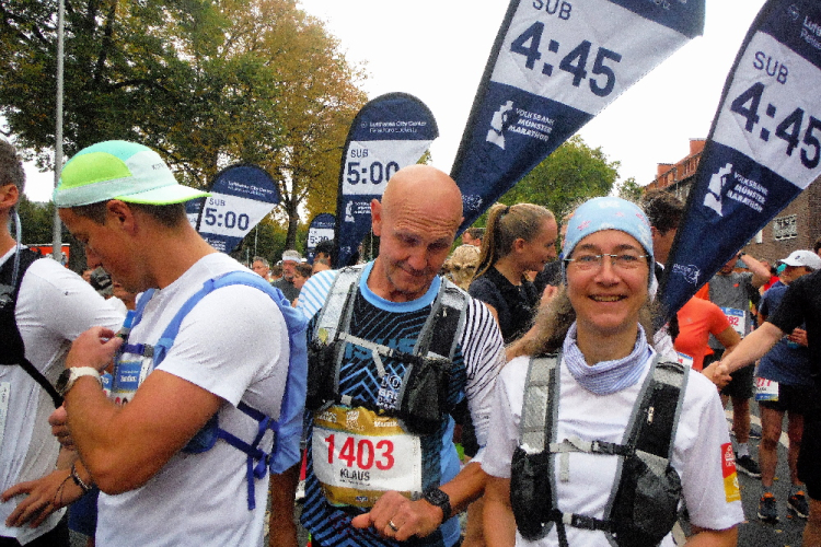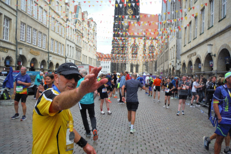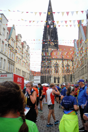 Anschließend bleibt noch genügend Zeit, die westfälische Metropole zu genießen und letzte Kräfte für den Sonntag zu tanken. Der Marathonsonntag beginnt, wie vorausgesagt, deutlich kühler. 20 Grad sollen nicht erreicht werden, dafür bleibt der befürchtete Regen aus. Temperaturmäßig ein idealer Lauftag. Auf dem Schlossplatz finden sich die Pacemaker ein. Klaus wird heute für seine Gruppe von Petra unterstützt, mit der ich vor 2 Jahren in Wilhelmshaven zum ersten Mal gemeinsam unterwegs war. Pünktlich werden wir auf die Strecke gelassen.