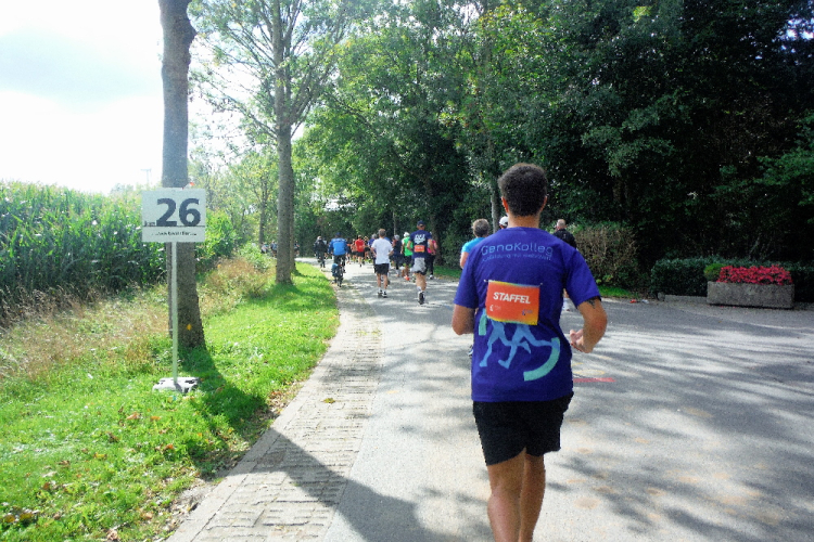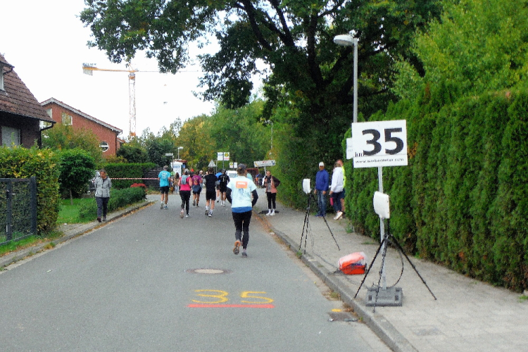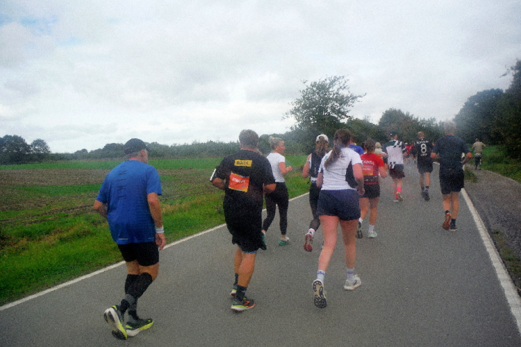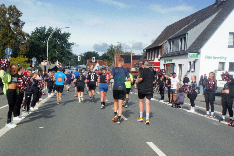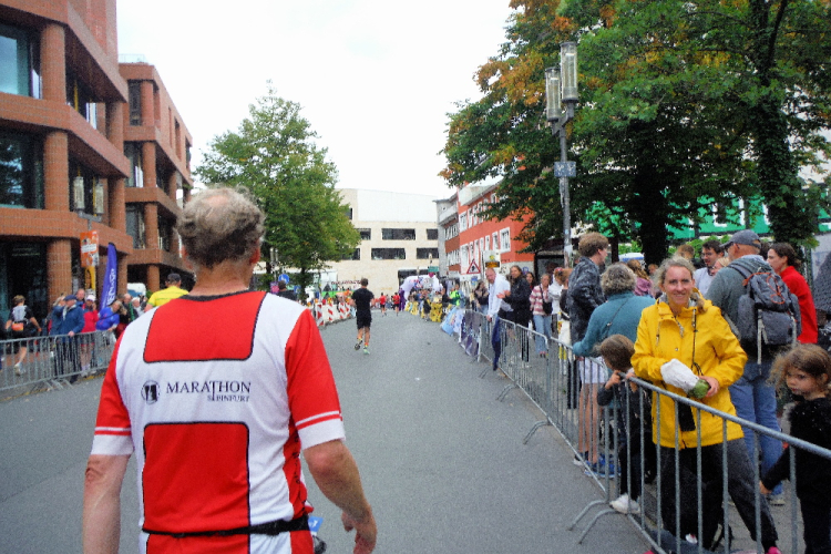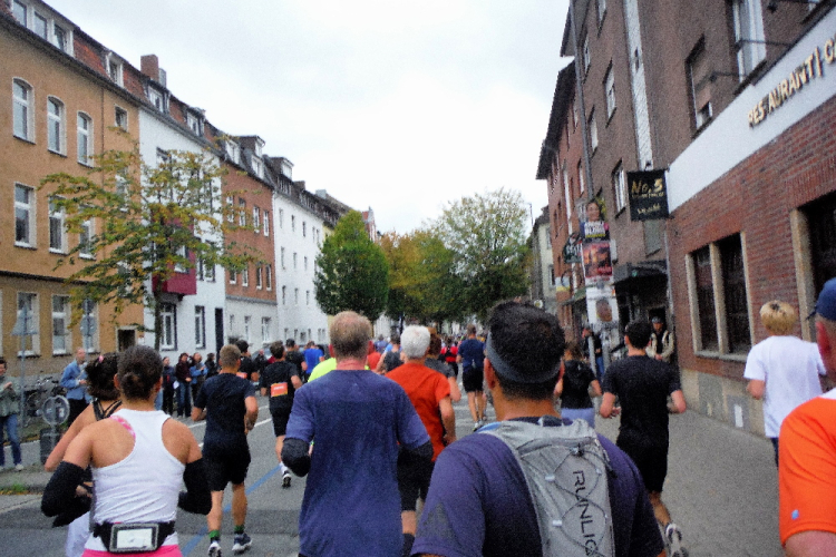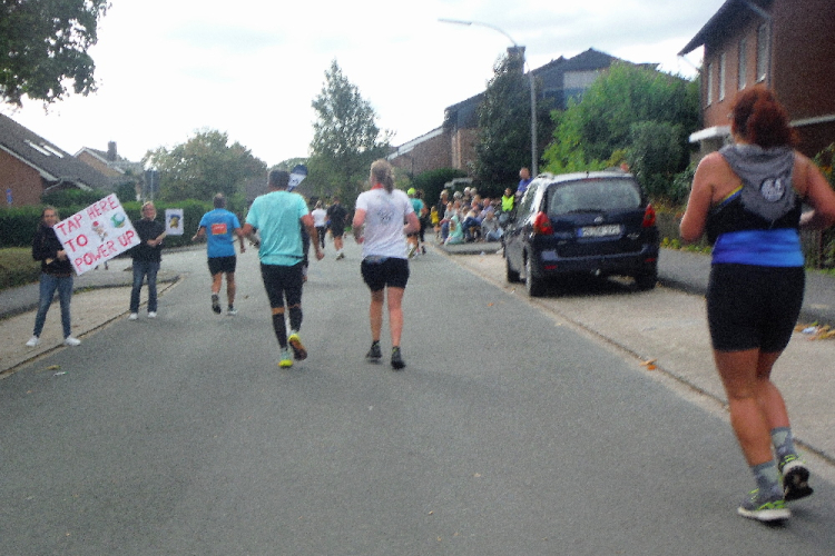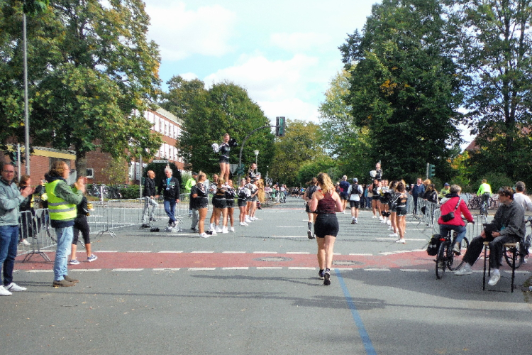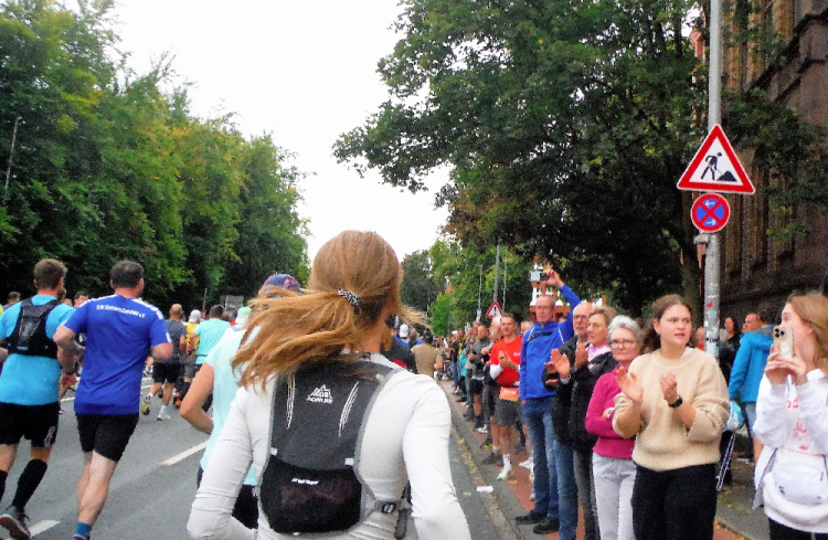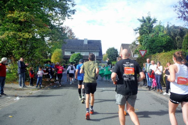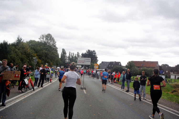 Ich bin in Richtung Nienberge unterwegs, als die Sonne die Wolken verdrängt. Damit hatte ich heute nicht mehr gerechnet. Dazu weht ein kräftiger Wind, der hörbar an meiner Startnummer zerrt. Immer wieder böig auffrischend wird er mich bis ins Ziel begleiten. Locker ausschreitend erreiche ich die Halbmarathonmarke. Von fetzigen Trommelrhythmen begleitet, laufe ich unermüdlich voran. Hier am Anfang von Nienberge warten erst die nächsten Staffelläufer und dann wieder zahlreiche Zuschauer, die mich durch den Ort treiben. Es kommt mir vor, als gäbe einen Wettstreit, welcher Vorort am meisten Zuschauer und Stimmung an die Strecke bringt.