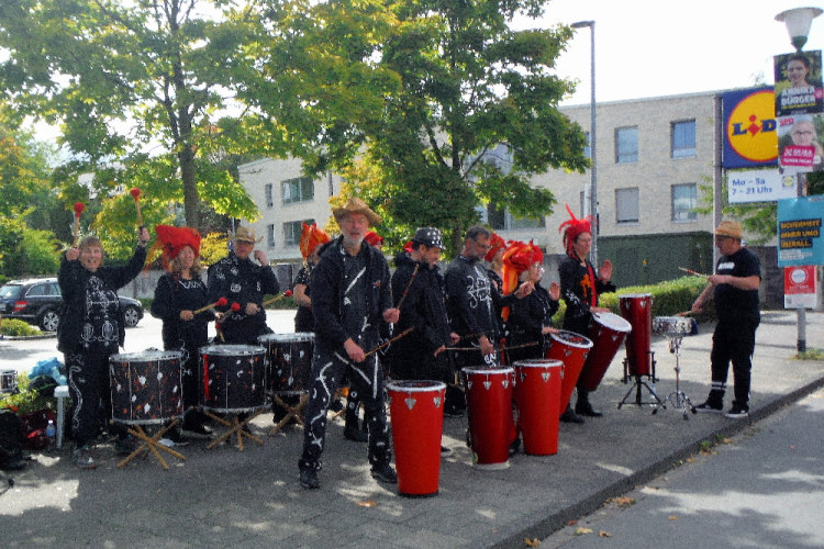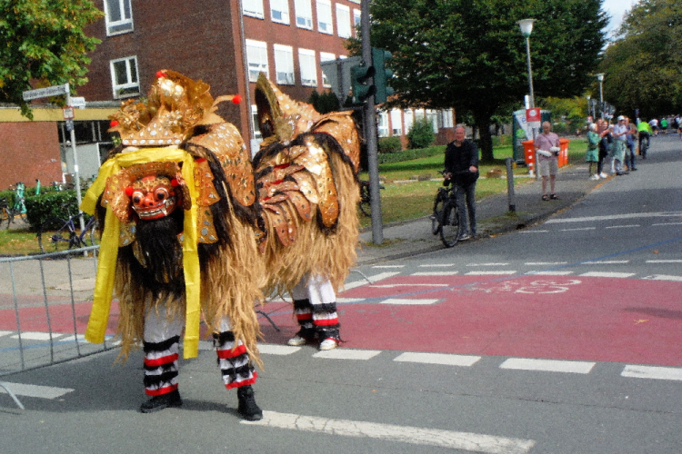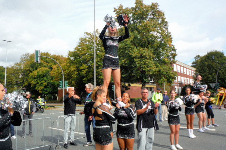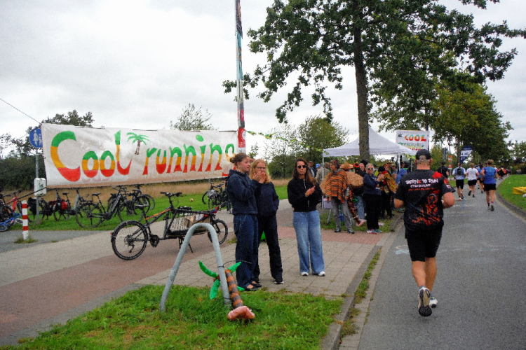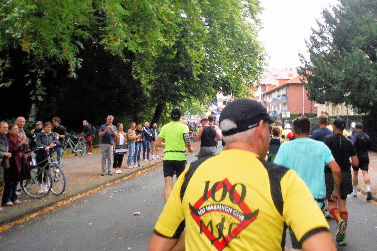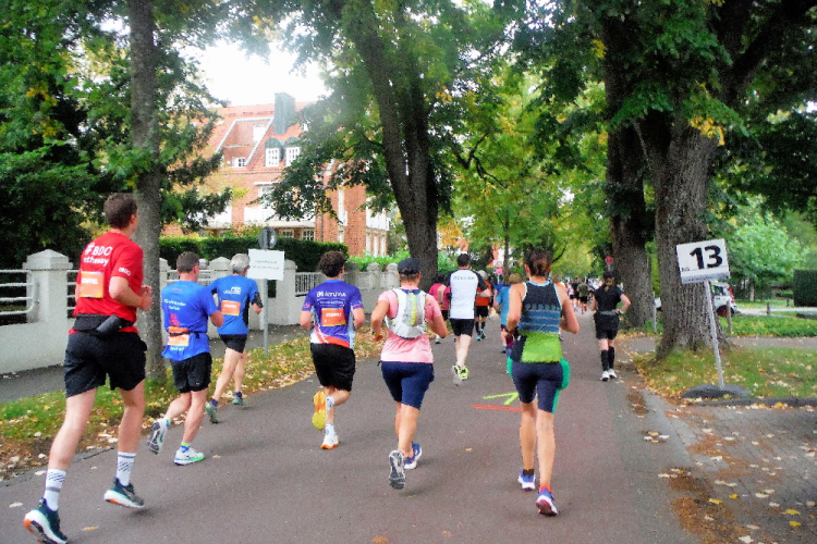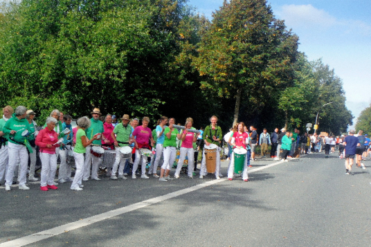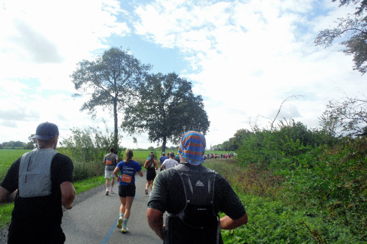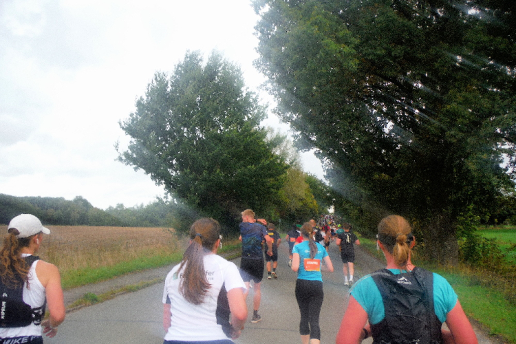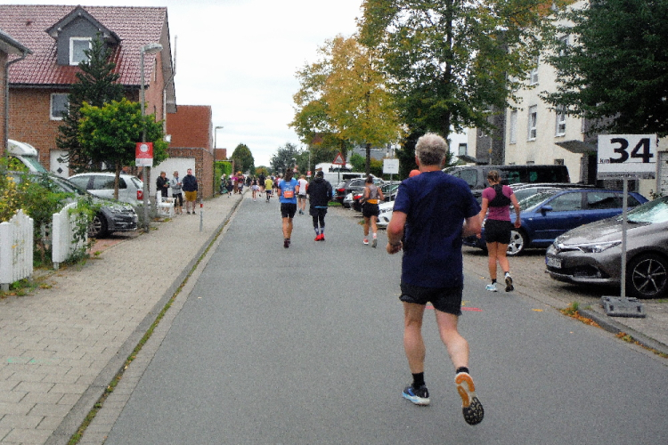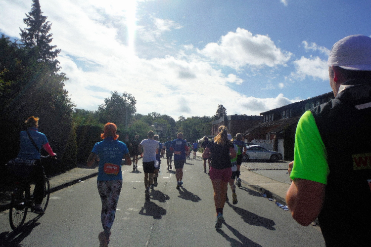 Ich bin in Richtung Nienberge unterwegs, als die Sonne die Wolken verdrängt. Damit hatte ich heute nicht mehr gerechnet. Dazu weht ein kräftiger Wind, der hörbar an meiner Startnummer zerrt. Immer wieder böig auffrischend wird er mich bis ins Ziel begleiten. Locker ausschreitend erreiche ich die Halbmarathonmarke. Von fetzigen Trommelrhythmen begleitet, laufe ich unermüdlich voran. Hier am Anfang von Nienberge warten erst die nächsten Staffelläufer und dann wieder zahlreiche Zuschauer, die mich durch den Ort treiben. Es kommt mir vor, als gäbe einen Wettstreit, welcher Vorort am meisten Zuschauer und Stimmung an die Strecke bringt.