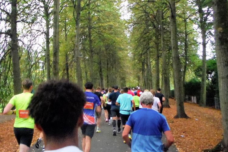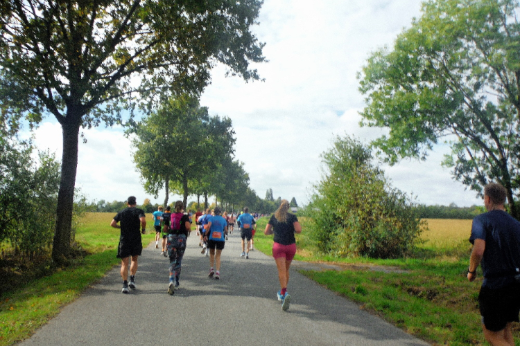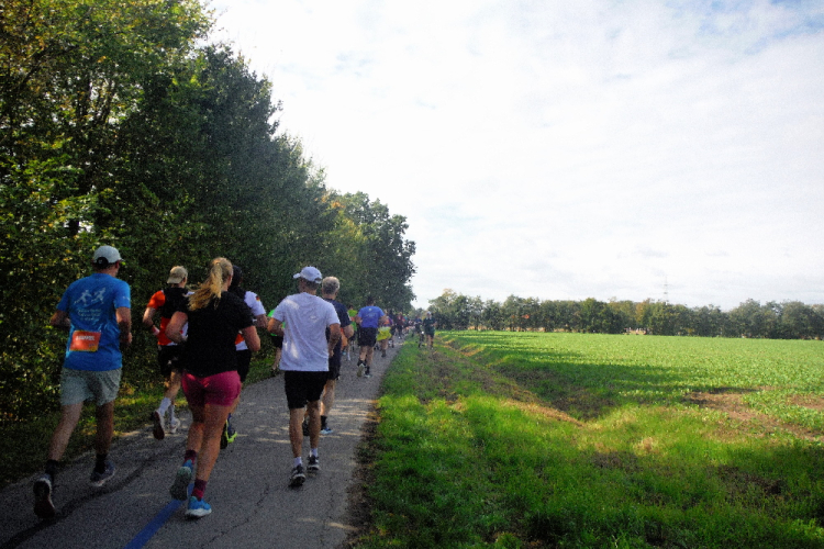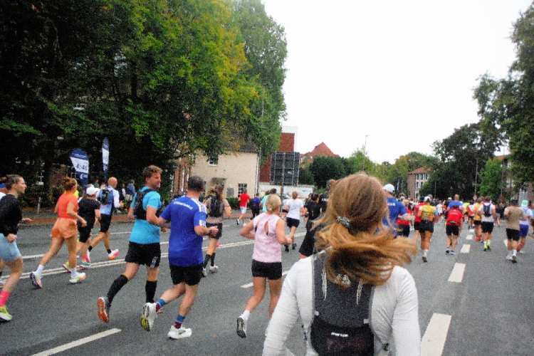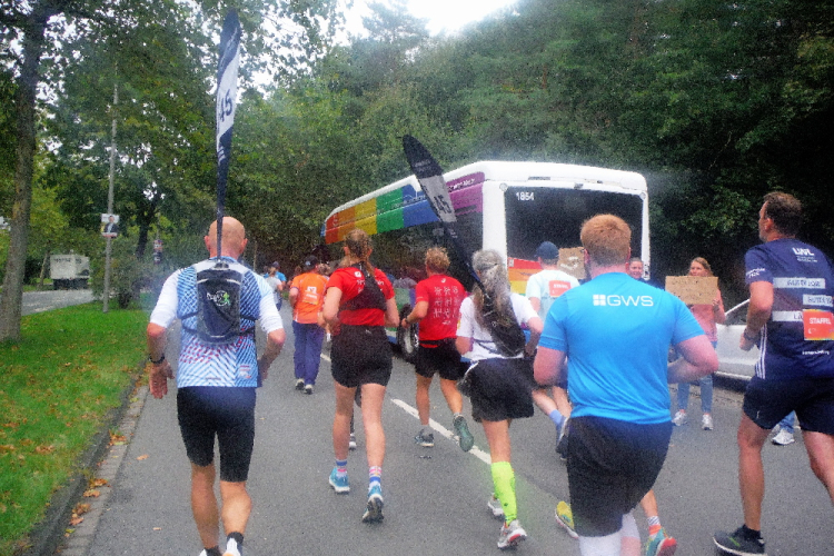Kurz nach einer Unterführung biege ich links ab. Früher war es hier sehr hell. Doch die im Boden eingelassene umgekehrte Pyramide musste einem Erweiterungsbau der medizinischen Fakultät weichen und der Abschnitt wirkt wie eine Straßenschlucht. Doch nur kurz, denn dann werden die Straßen deutlich breiter. Ich erkenne den bunten Besenbus und hoffe, ihm nicht noch einmal zu begegnen. Im Norden von Gievenbeck wartet ein aufgelockertes Wohngebiet, bevor ich über Land zur Halbmarathonmarke nach Nienberge geführt werde. Wie immer sind hier viele Bewohner an der Strecke und feiern „ihren“ Marathon. Die Stimmung, für die der Münster Marathon bekannt ist, ist wieder überwältigend.