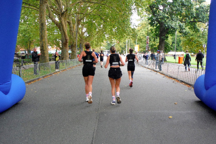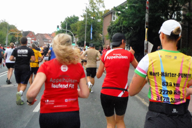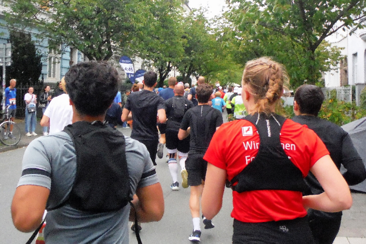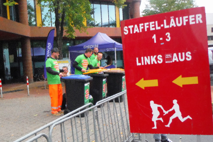10 KM liegen hinter uns, als wir der Aegidistraße nach Süden folgen. Am gleichnamigen Tor wartet die erste Staffelablösung. Zahlreich sind wir von den ersten Startern bereits überholt worden. Erkennbar an den Staffelschildern auf dem Rücken.