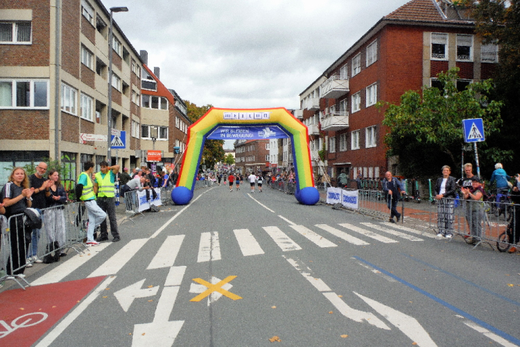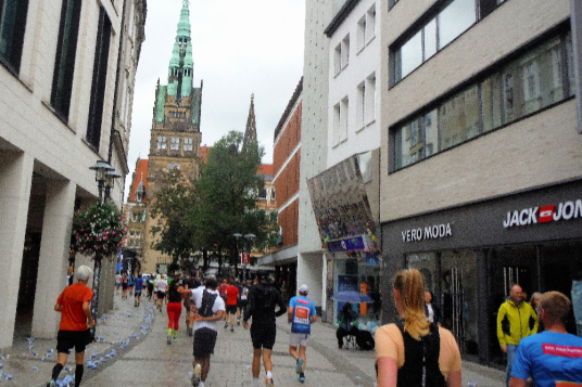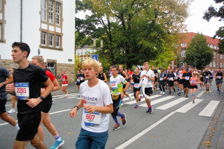 Im hinteren Feld geht der Startschuss fasst unter. Gemächlich nähern wir uns der Startlinie. Rechtzeitig können wir in einen Laufschritt übergehen und befinden uns schon auf der Strecke. Rechts und links säumen zahlreiche Zuschauer die Straße. Lautstark werden wir angetrieben. Die ersten Meter nach Süden, vorbei am Paulinum mit der Startnummernausgabe. Nach dem Lauf bestehen hier Möglichkeiten zum Duschen und seine Medaille gravieren zu lassen.
