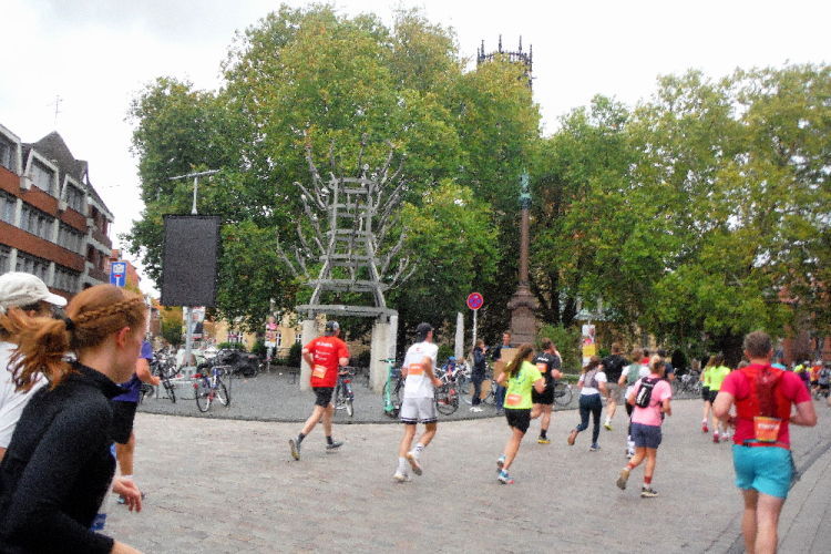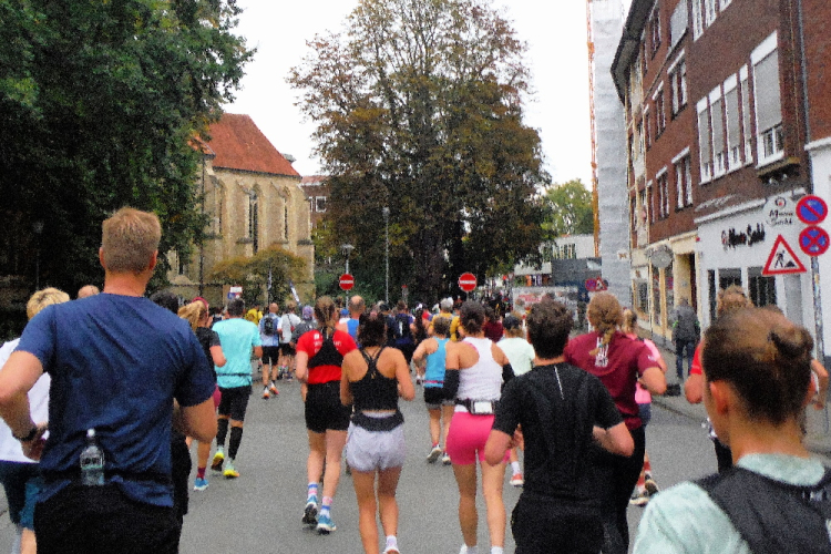 Kurz darauf biegen wir am Aegiditor links ab und laufen Richtung Innenstadt. Der erste Kilometer gibt hier bereits einen Vorgeschmack auf den letzten, denn in diesem Bereich sind sie identisch. Doch davon trennen mich noch 40 Kilometer. Erst einmal biege ich nach links ab. Hier nähern wir uns wieder dem Schlossplatz. Hier applaudieren uns die Zuschauer ein zweites Mal. Rechts vor mir läuft ein Finisher des Hermannslaufes. Als mehrfachem Teilnehmer weckt dies natürlich mein Interesse, weshalb ich Michael und seiner derzeitigen Begleitung ein wenig lausche. Da wir alle Drei aus Ostwestfalen stammen, wird es sehr unterhaltsam auf den kommenden Kilometern. Die Überwasserkirche haben wir nach knapp zwei Kilometern voraus im Blick, dafür das für die Wilsberg-Verfilmungen genutzte Antiquariat Sölder nicht. Links entschwindet der Kiepenkerl und schon führt uns die Neubrückenstraße zum ersten Mal in Richtung Promenade, dem ehemaligen Festungsring, dem wir nach Westen folgen. Heute wird die Promenade hauptsächlich als Fahrradstraße genutzt, bleibt während des Marathons aber uns Läufern vorbehalten.