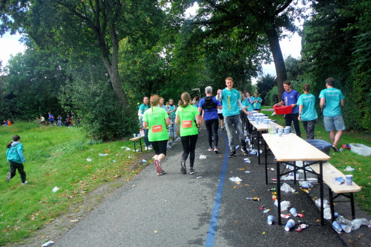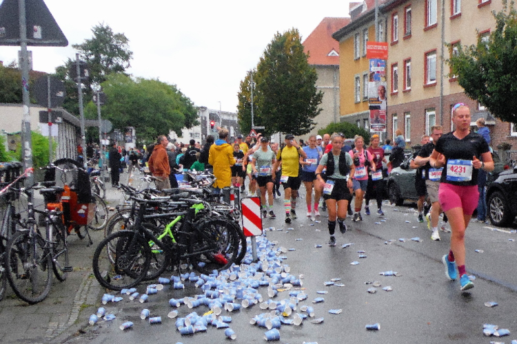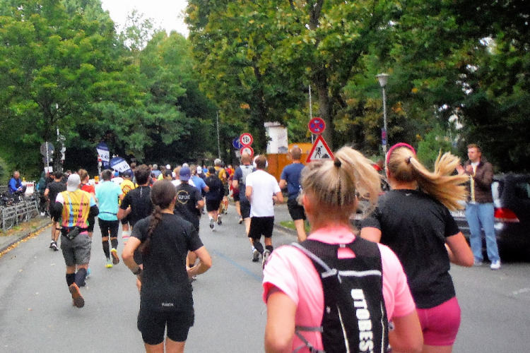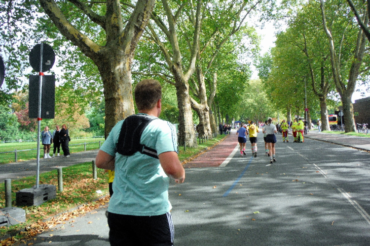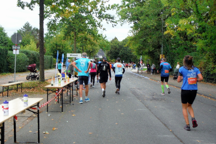Nach einem kurzen ersten Eindruck von der Promenade biegen wir nach Norden ab. Auf den folgenden Kilometern durchlaufen wir das Kreuzviertel. Dieses gründerzeitliche Wohnviertel mit seinen zahlreichen Gebäuden im Jugendstil schmeichelt dem Auge. Die zahlreichen Bäume sorgen für ein angenehmes Klima, auch heute beim Laufen. Wegen der zahlreichen Cafes, Boutiquen und Restaurants verwundert seine Beliebtheit nicht. Die Zuschauermenge reißt auch nicht ab und kurz vor KM 5 wartet die erste von insgesamt 15 Verpflegungsstation. Vorerst genügt das gereichte Wasser, das bereits hier zahlreiche Mägen füllt.