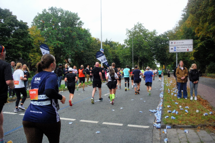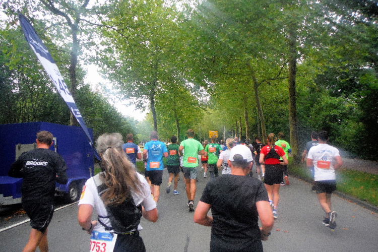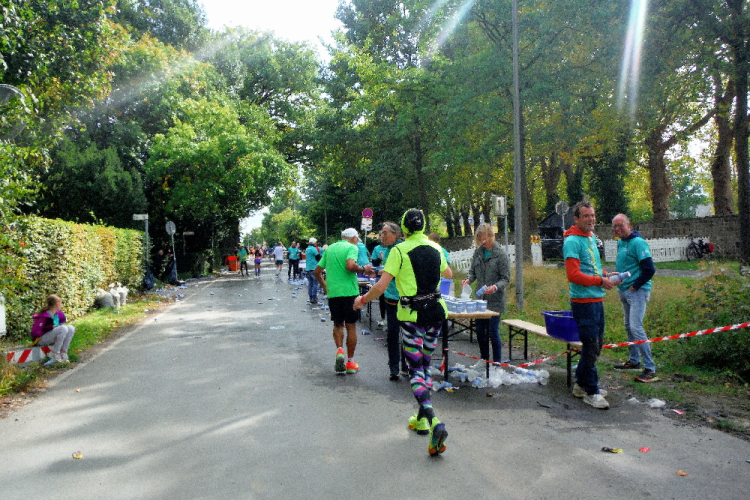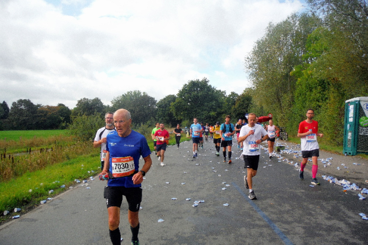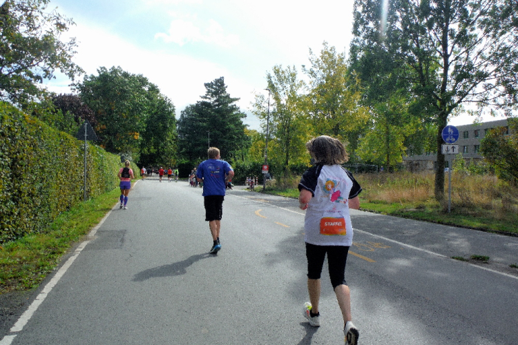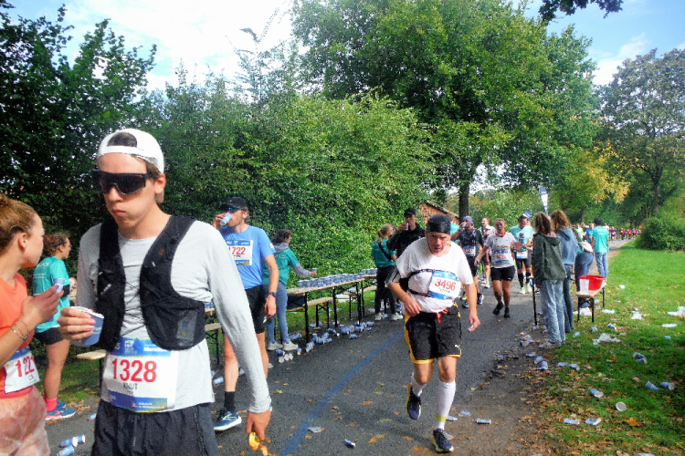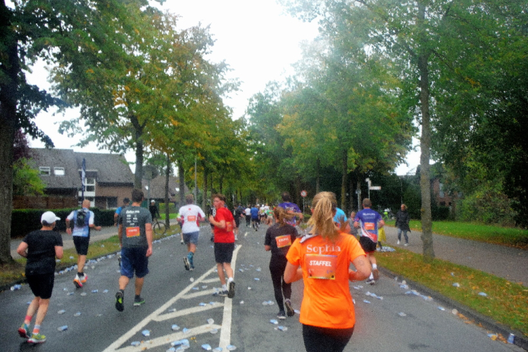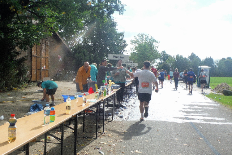 Auf dem Ring überqueren wir den Aasee, um ihn kurz darauf in Richtung Nordosten hinter uns zu lassen. Einfach geradeaus laufend erreichen wir die Himmelsreichallee. Ein Drittel des Marathons sind gemeistert und das Tempo scheint auch okay. Petra und Klaus habe ich immer noch im Blick. Dafür verliere ich Michael an einer der Verpflegungsstationen.