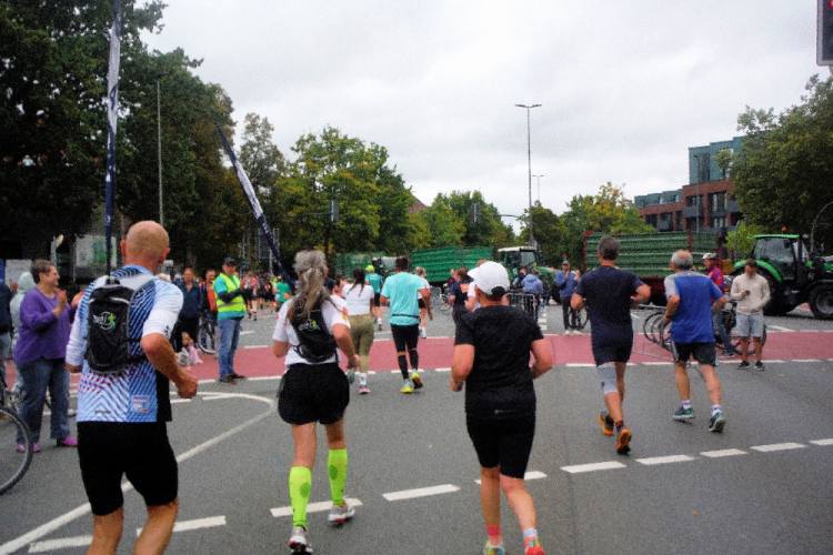 Die folgenden Kilometer führen in Richtung Nordwesten durch Gievenbeck nach Nienberge. Über den äußeren Ring laufe ich zum Naturwissenschaftlichen Zentrum Münsters. Das Verlassen des Ringes markieren 3 Trecker mit Anhänger, geschuldet einem verschärften Sicherheitskonzept. Dabei fühle ich mich den ganzen Marathon über sehr sicher.