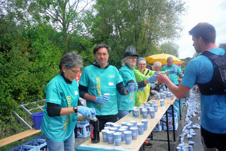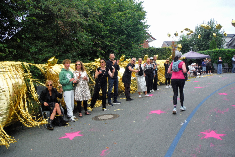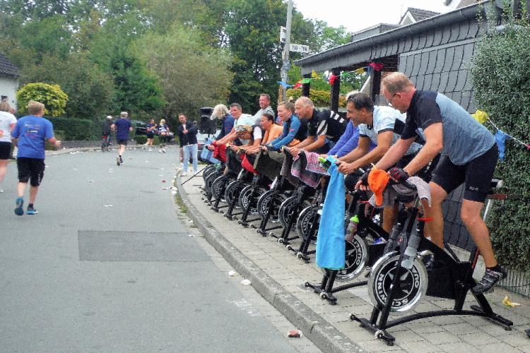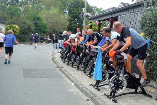 Nachdem der letzte Staffelwechsel noch einmal für Abwechslung sorgt, geht der Blick weit voraus, denn bis Gievenbeck bei KM 33 geht es fast nur geradeaus. Da ist die Anwesenheit der Pacer doppelt hilfreich. Über der Straße hängen an einer Leine zahlreiche Finisher-Shirts, für alle Jahrgänge ist sie mittlerweile nicht lang genug. Die Spinning-Gruppe tritt kräftig in die Pedale, kommt aber die jedes Jahr nicht vom Fleck. Dann werde ich auf dem Walk of Fame begrüßt, die Anwohner unterstützen füttern uns mit Traubenzucker, zur Erfrischung sind diverse Gartenduschen aktiv.