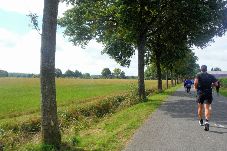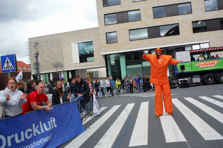Schon liegen 23 Kilometer hinter mir und es erwarten mich die nach Süden in Richtung Roxel führenden Kilometer. Zahlreiche Bäume spenden immer wieder Schatten. Zuschauer warten und unterstützen an den verschiedenen Kreuzungen. Die meisten von ihnen sind, wie im Münsterland üblich, mit dem Rad unterwegs. Immer wieder treiben mich Trommlergruppen an und auch für die nötige Stärkung wie mit dem Verpflegungspunkt am Haus Vögeding ist gesorgt. Der Abschnitt bleibt so die ganze Zeit kurzweilig und so ist bei KM 28 Roxel schnell erreicht.