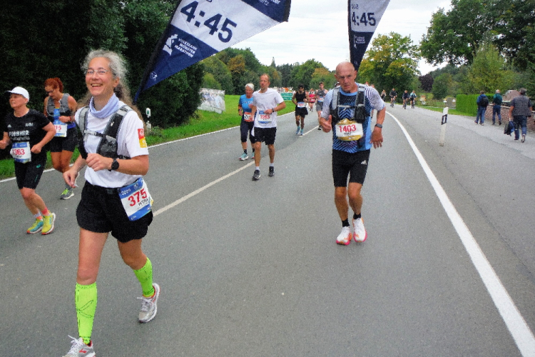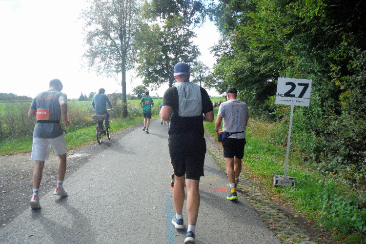 Dann liegt KM 35 hinter mir. Mitten in Gievenbeck fällt mir das Laufen wie immer schon schwer, weshalb ich Klaus und Petra endgültig ziehen lasse. Ich orientiere mich an vereinzelten Mitläufern, die auch schon in den Gehen-Laufen-Wechselmodus übergegangen sind. Aus Gievenbeck heraus wartet noch einmal eine Steigung. Ein Marathonneuling macht einen verzweifelten Eindruck. Ich kann ihn ermutigen, dran zu bleiben. Wer es bis hierhin schafft, schafft es auch ins Ziel. Insgesamt geben die Veranstalter den Marathonis 6 Stunden Zeit. Aber so lange wollen wir nicht unterwegs sein.