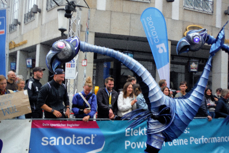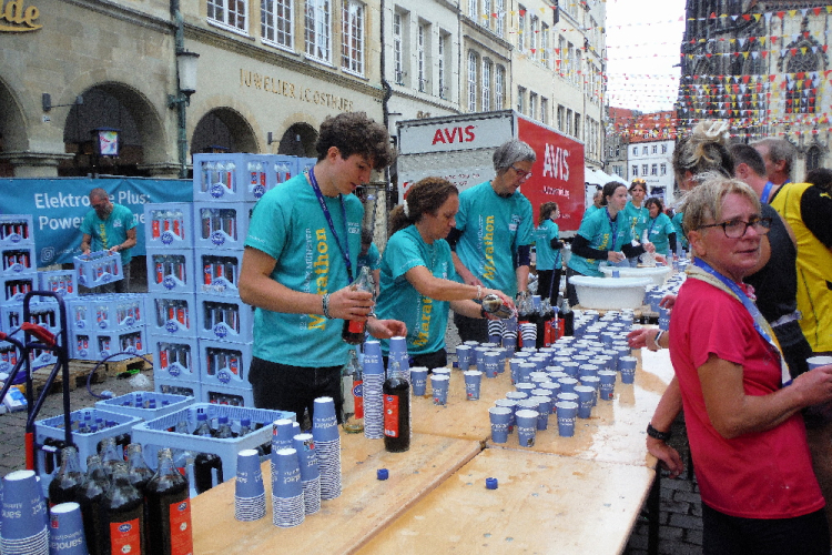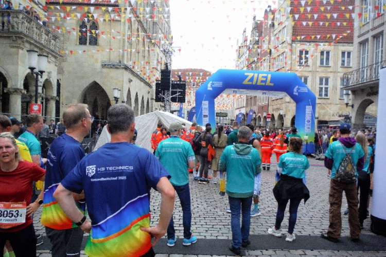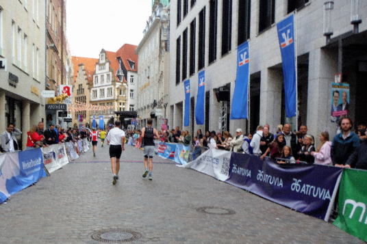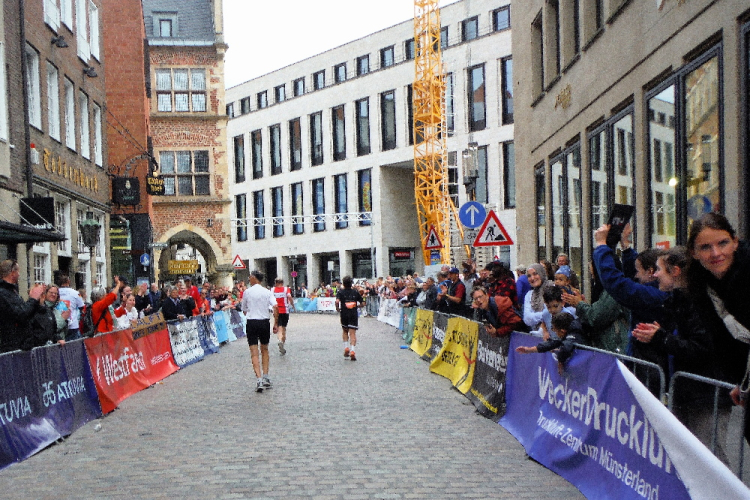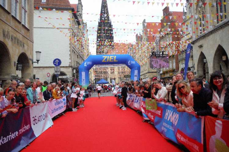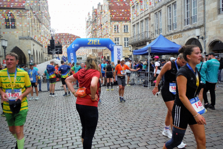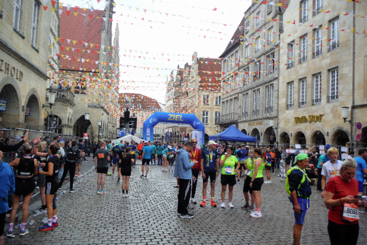 Auf den letzten Kilometern strahlt die Sonne mit den Läufern und Zuschauern um die Wette. Cheerleader feuern uns an. Bevor der bunte Drache Feuer spuckt, habe ich ihn passiert. Wer mag, kann sich bei afrikanischen Rhythmen mit einem Schoppen Wein auf das Finish einstimmen. Die Aegidistraße bringt uns zurück in die Innenstadt und zum Ziel auf dem Prinzipalmarkt. Ich lasse mir Zeit und genieße die einmalige Atmosphäre und den Applaus der vielen Zuschauer. Dann lasse ich mir die wohlverdiente Medaille umhängen.