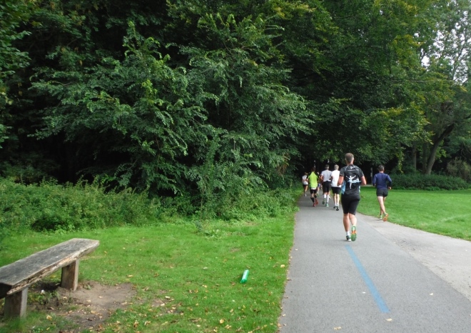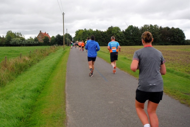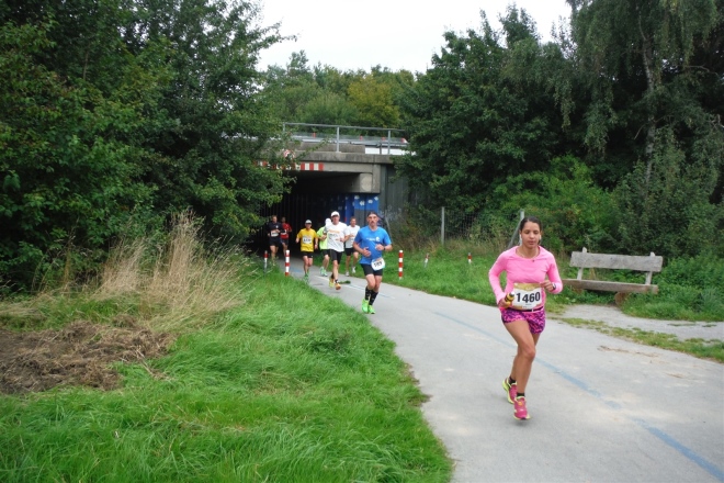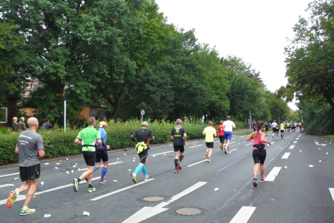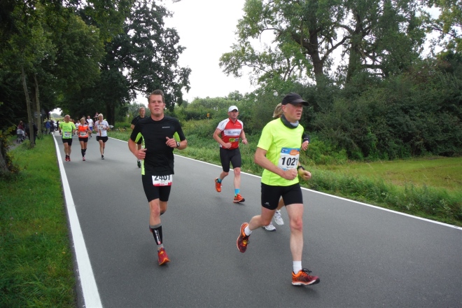 Das Ufer des Sees ist als Park angelegt, der auch viel von den hiesigen Joggern genutzt wird. Auch heute falle ich mit meiner goldenen Startnummer auf, die mich als fleißigen Münsteraner Marathonläufer ausweist. Ich bin dankbar für meine regelmäßigen Teilnahmen und weiß es richtig einzuschätzen, denn nicht jedem ist es vergönnt, über einen Zeitraum von 14 Jahren oder länger fit für einen regelmäßigen Marathon zu bleiben. Ein leichter Sprühregen reißt mich aus meinen Gedanken. Sollte es jetzt doch noch nass auf der Strecke werden? Meine Befürchtungen verflüchtigen sich schnell, denn als ich bei KM 13 vorläufig das Ende des Aasees erreiche, ist das Regenintermezzo bereits Geschichte.