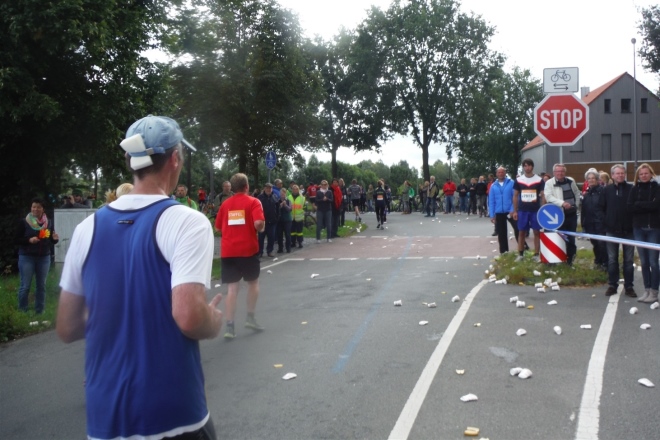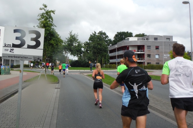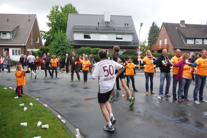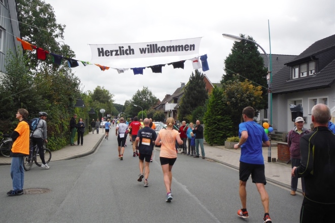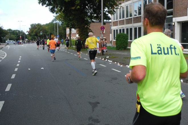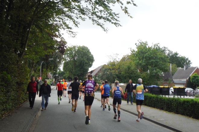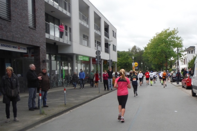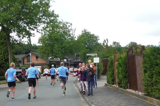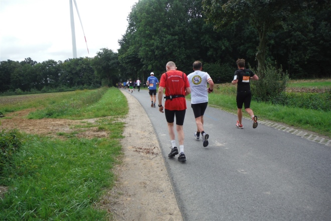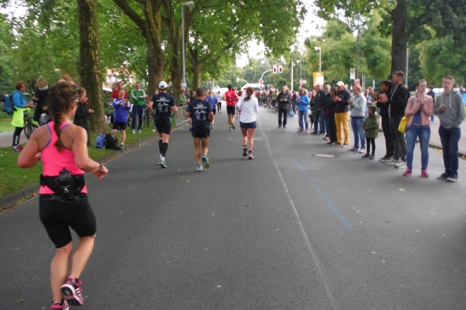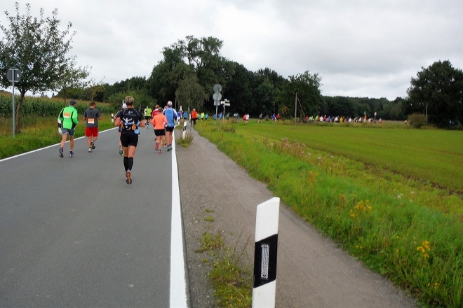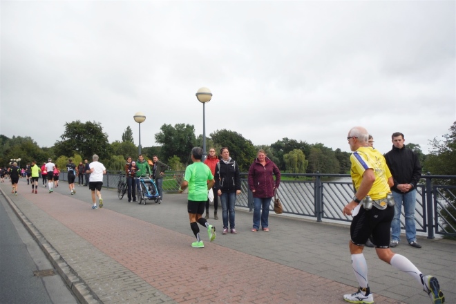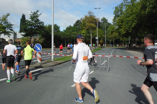 Kurz hinter der Halbmarathonmarke erreiche ich Nienberge. Am Ortseingang findet bereits der zweite Staffelwechsel statt. Den frischen Läufern hat sich Daniel wohl angeschlossen, denn seit der letzten Verpflegungsstation habe ich ihn nicht mehr gesehen. Wie ich hinterher erfahre, ist er auf der zweiten Hälfte tatsächlich deutlich schneller unterwegs gewesen. Bei seinem Debüt hat er damit gleich einen negativen Split erreicht. Ich brauchte dafür einige Marathonläufe mehr und gratuliere zur perfekten Renneinteilung. Mir klingt derweil Helene mit ihrem „Atemlos“ entgegen. Die Zuschauer wiegen sich dazu im Takt. Ich schließe mich nicht an, sondern konzentriere mich auf das Laufen. Noch liegen 20 Kilometer vor mir und ich will meine Lieben nicht zu lange warten lassen.