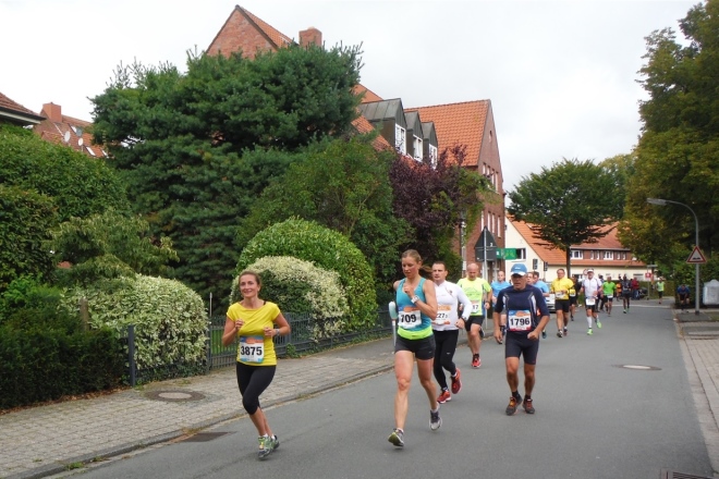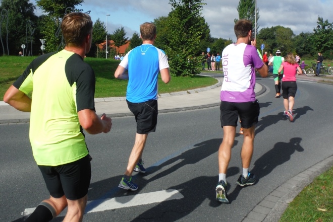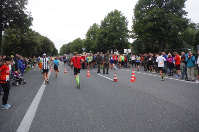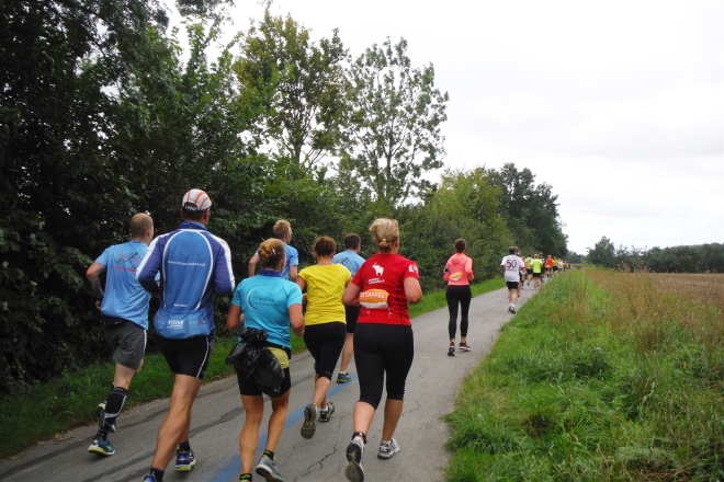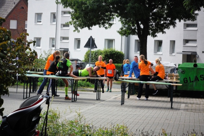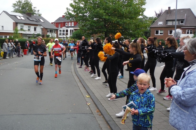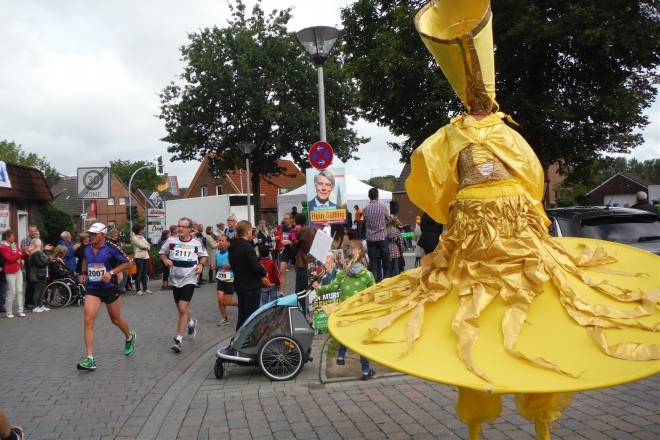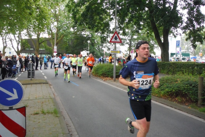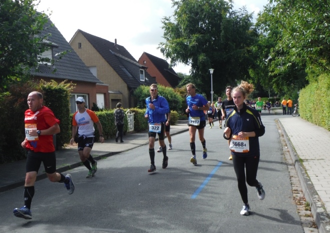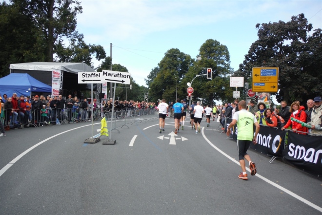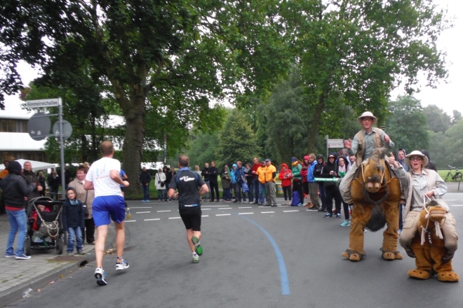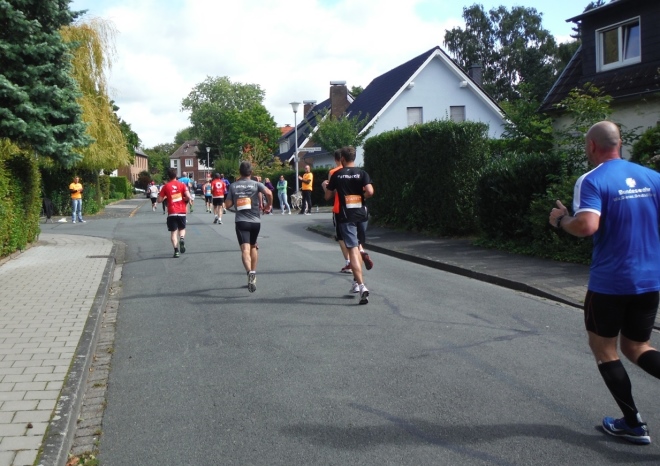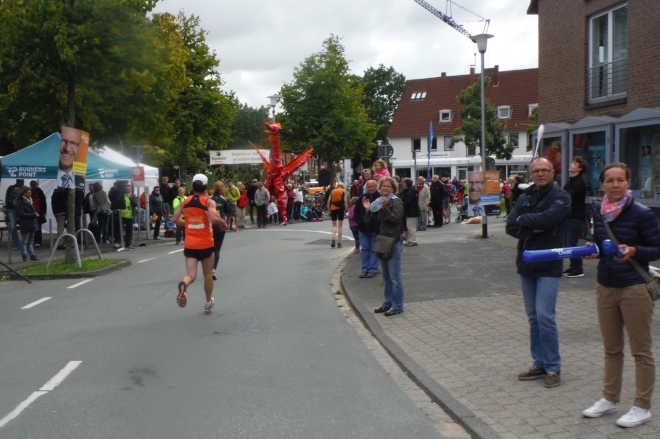 Kurz hinter der Halbmarathonmarke erreiche ich Nienberge. Am Ortseingang findet bereits der zweite Staffelwechsel statt. Den frischen Läufern hat sich Daniel wohl angeschlossen, denn seit der letzten Verpflegungsstation habe ich ihn nicht mehr gesehen. Wie ich hinterher erfahre, ist er auf der zweiten Hälfte tatsächlich deutlich schneller unterwegs gewesen. Bei seinem Debüt hat er damit gleich einen negativen Split erreicht. Ich brauchte dafür einige Marathonläufe mehr und gratuliere zur perfekten Renneinteilung. Mir klingt derweil Helene mit ihrem „Atemlos“ entgegen. Die Zuschauer wiegen sich dazu im Takt. Ich schließe mich nicht an, sondern konzentriere mich auf das Laufen. Noch liegen 20 Kilometer vor mir und ich will meine Lieben nicht zu lange warten lassen.