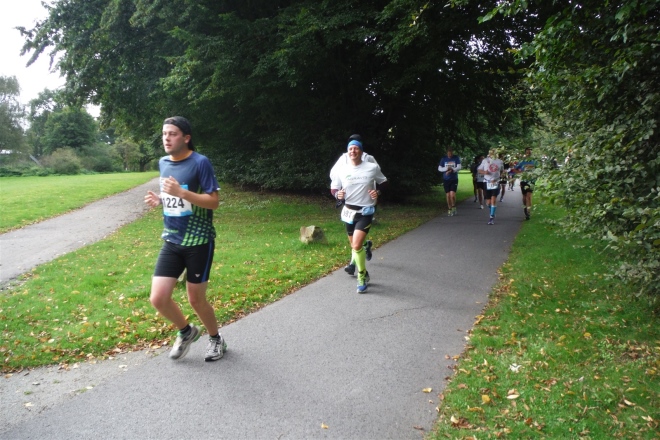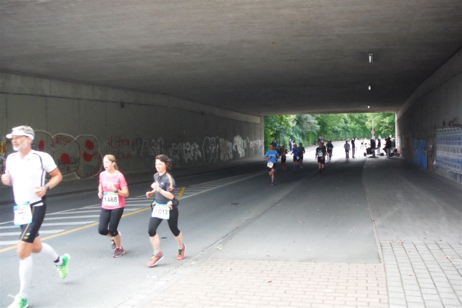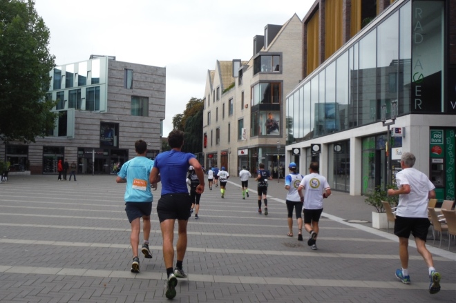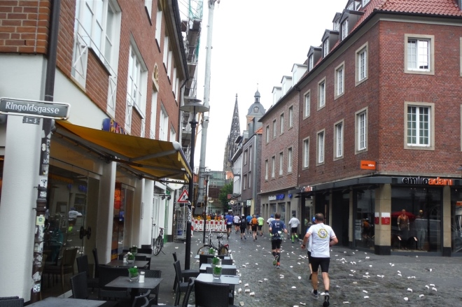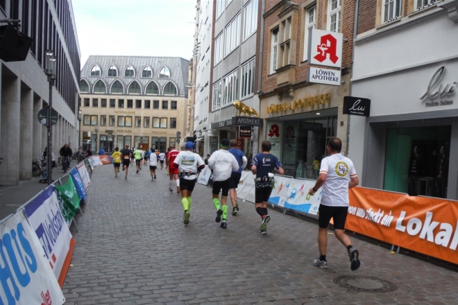 Etwas düster wirkt derzeit noch die Promenade. Die Sonne, die sich zu Beginn des Laufes zeigte, hat sich hinter Wolken verzogen und das dichte Blattwerk läßt kaum Licht durch. Für die gute Laune sorgt da eher das Publikum, das uns bei der Unterführung bei KM 7 mit einer La Ola begrüßt. Bis etwa KM 8 kann ich anschließend noch die Promenade genießen, ehe ich über den Ludgerikreisel den Marienplatz erreiche.