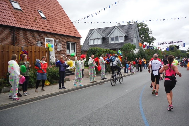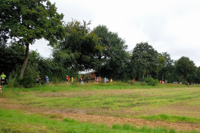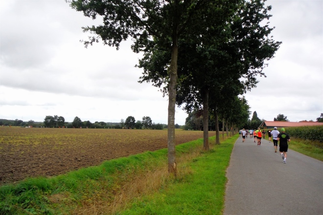 KM 23, ich verlasse Nienberge. Die nächsten 4,5 Kilometer führen durch Feld und Flur nach Roxel. Werden wir Läufer jetzt uns selbst überlassen? Nein, denn auch hier bilden sich an jeder Kurve und jeder Straßenüberquerung Zuschauer- und Stimmungsnester. Für Abwechslung ist also weiter gesorgt.