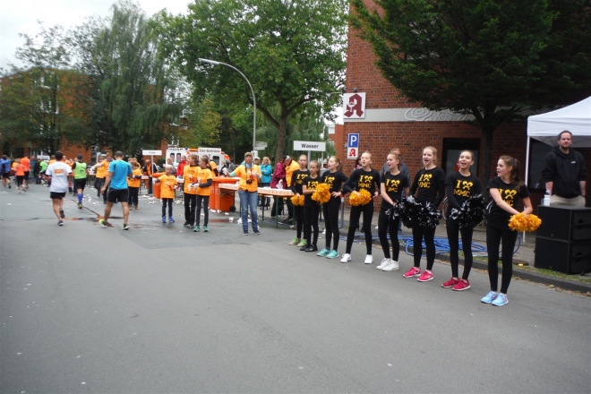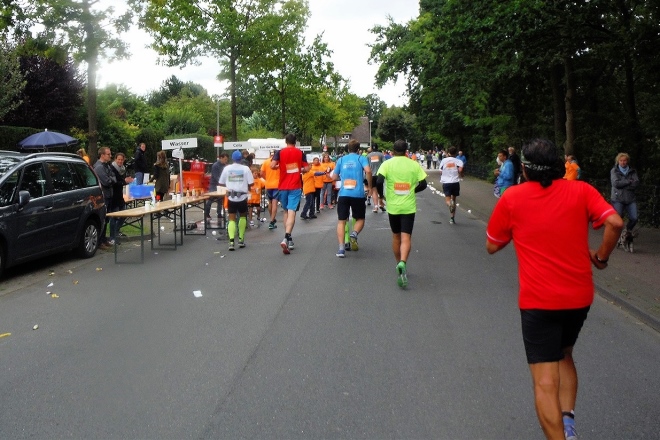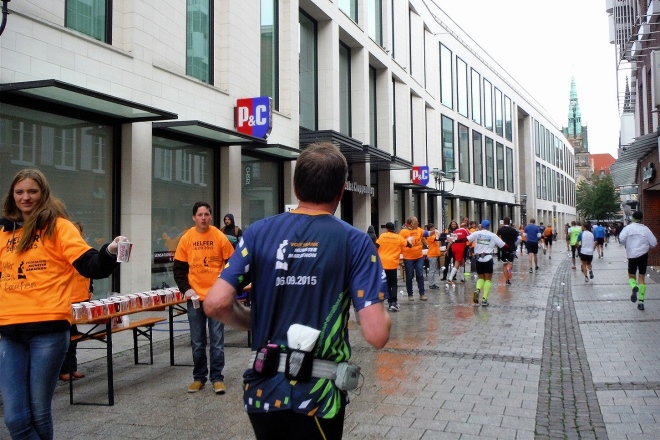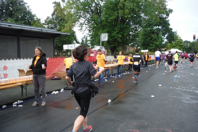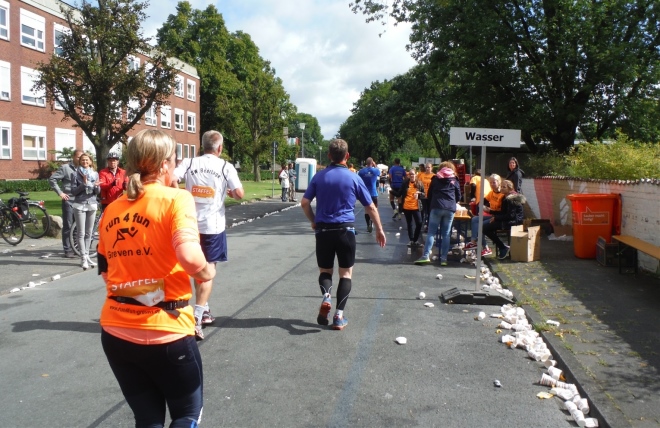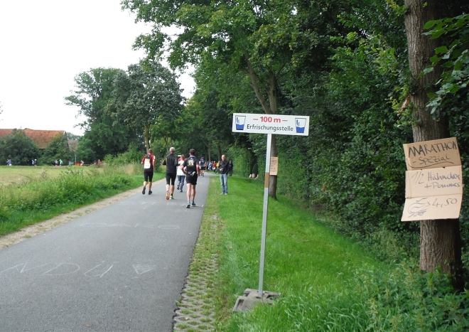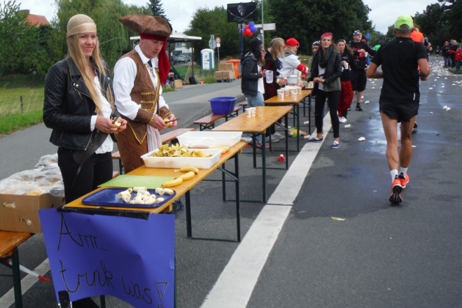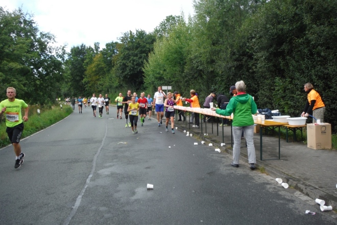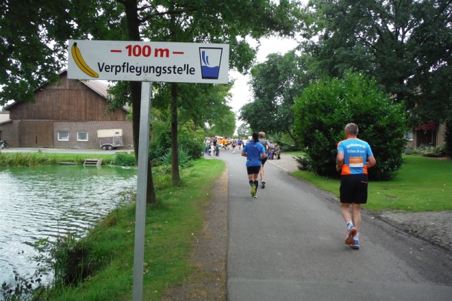 17 Verpflegungs- und Erfrischungspunkte an der Strecke und Verpflegung im Ziel. Gereicht werden Powerrade, Wasser und Cola. Dazu Bananen- und Apfelsinenstücke. An den Erfrischungspunkten nur Wasser.