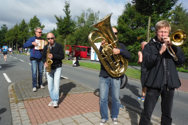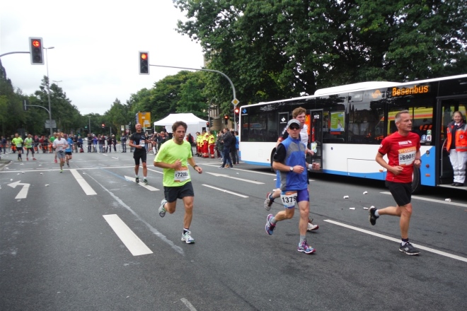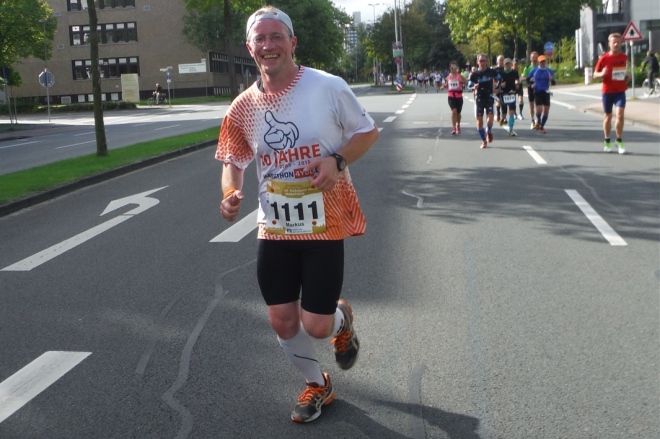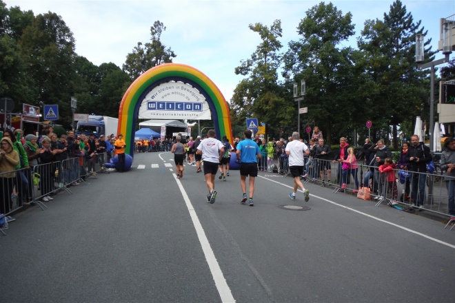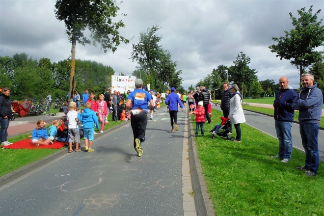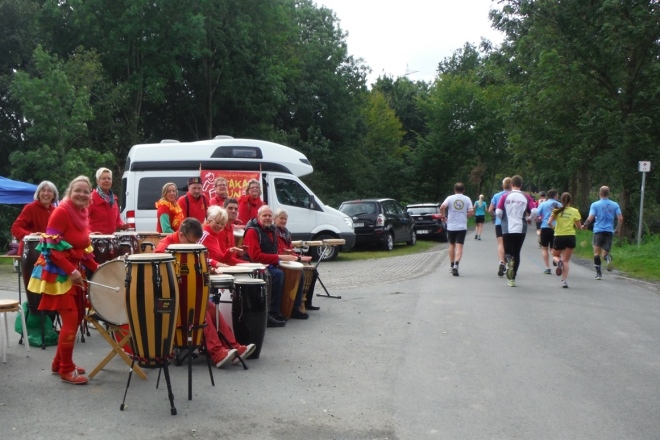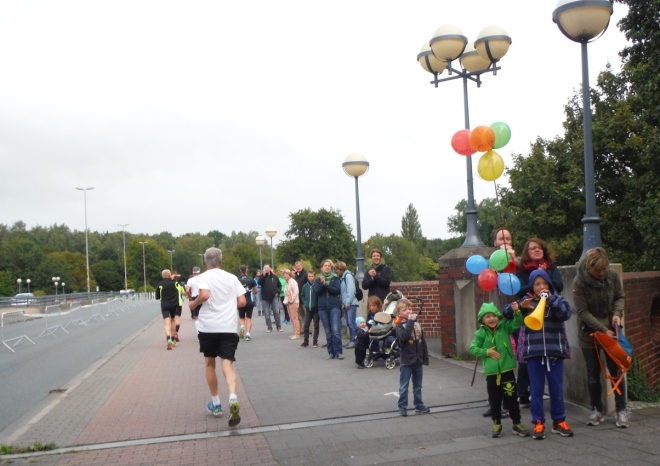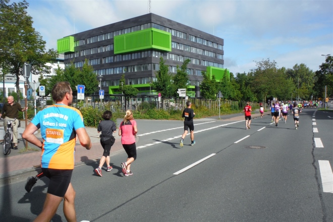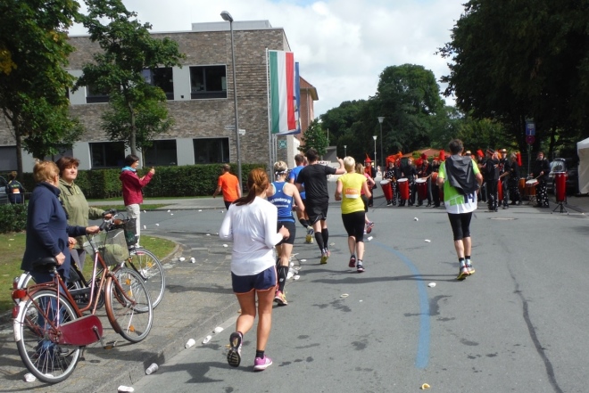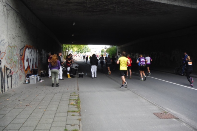 Auf den folgenden Kilometern passiere ich das LBS-Gebäude. Hier starten später die Kids zu ihrem Zieleinlauf. Einige warten bereits aufgeregt. Kurz darauf treiben mich die Rhythmen einer mir seit Jahren bekannten Trommlergruppe an. Sie trauen dem Wetter noch nicht so richtig und haben es sich unter einem Zeltdach eingerichtet. Auch wenn ich mich bereits deutlich von der Kernstadt entferne, ist der Zuspruch der Zuschauer immer noch groß. Als ich nach rechts auf den äußeren Ring einbiege, brandet mir ein richtiger Jubelsturm entgegen.