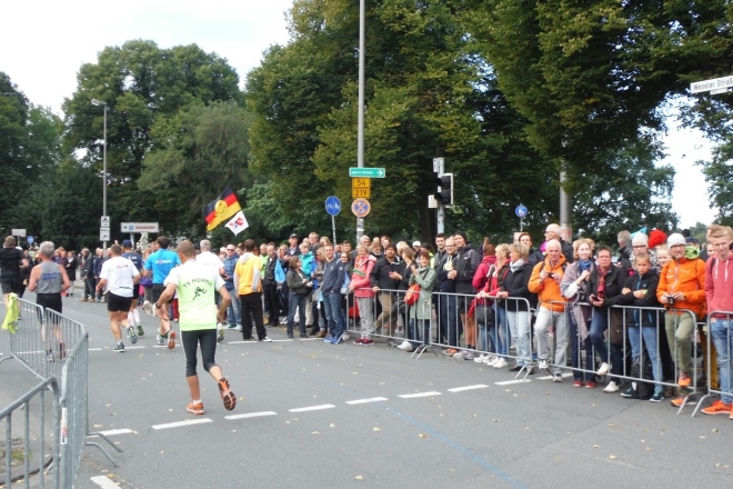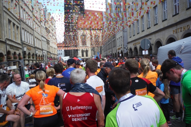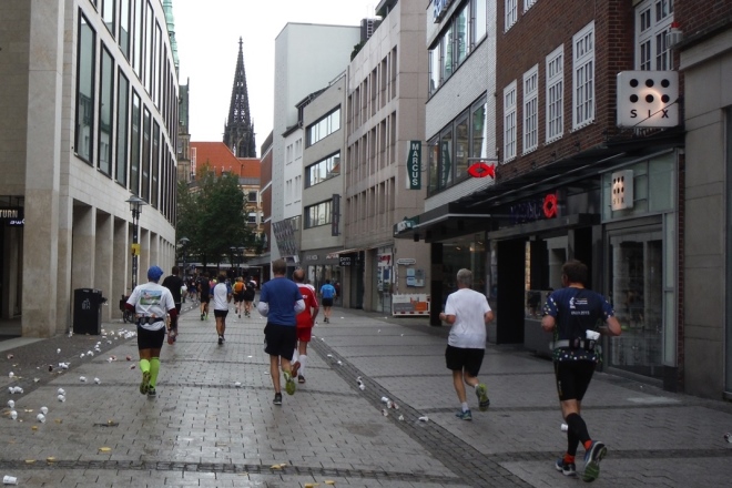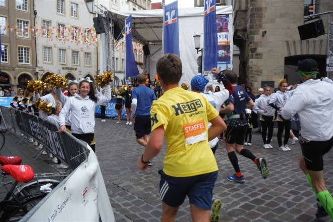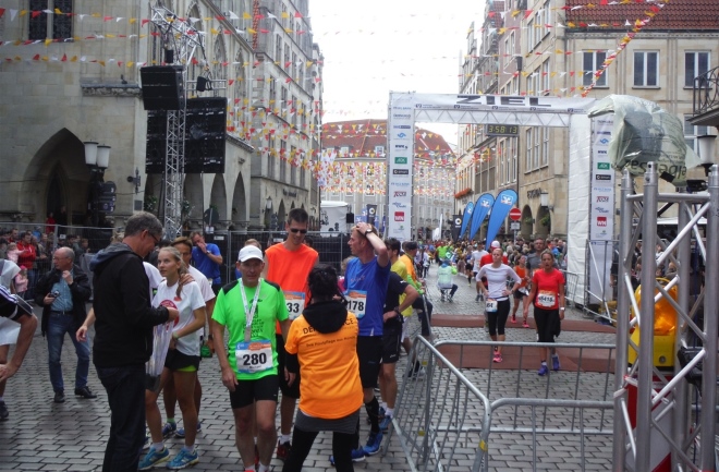 KM 41 ist geschafft. Die Umrundung des Aasees habe ich jetzt vollendet. Bereits hier ist für die Zuschauer abgesperrt. Es sind tausende, ich habe freie Bahn. Macht Platz möchte ich rufen, um zu überholen. Aber die Beine machen nicht mit. Dann lieber weiter im gewohnten Trott. Ist auch viel angenehmer. Hinein durch das Aegiditor in die Innenstadt. Die Stimmung ist der helle Wahnsinn. Das macht Münster keiner nach. Letzte Trommler treiben mich voran. Nur noch nach rechts einbiegen in Richtung Prinzipalmarkt. Da wartet schon Nikita auf mich, um mich ins Ziel zu schleppen. Klappt nur bedingt. Trotzdem lege ich noch etwas Tempo zu. Erst kommen die Wimpel in Sicht und dann endlich das Ziel. Der Geräuschpegel steigt noch einmal an. Ich bin nur am Genießen. Bilder mache keine, das ist heute Chefsache.