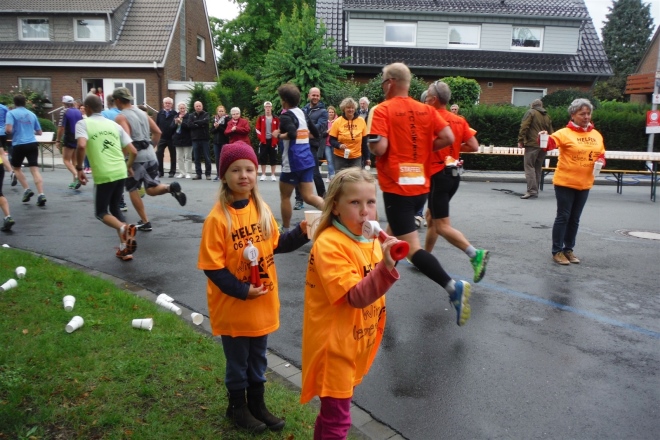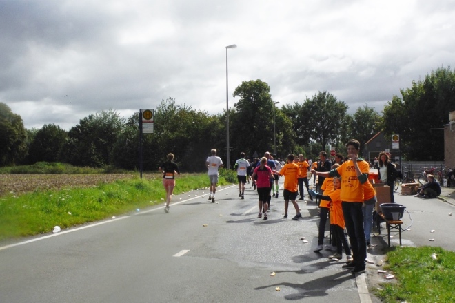 Nicht nur mich bremst der Wind aus, sondern auch die Topläufer, wie ich nachher erfahre. Für einen neuen Streckenrekord reicht es in diesem Jahr erneut nicht. Auch wenn das Tempo bei mir nicht die entscheidende Rolle spielt, bin ich froh, bei etwa KM 28,5 Roxel zu erreichen. Die Bebauung gibt ein wenig Windschatten und das Laufen fällt wieder leichter. Der nächste Powerpoint wartet bereits. Getragen von einer Welle der Euphorie biege ich nach links ab. Über die Straße ist eine Leine gespannt mit den mir bekannten Finisher-Shirts aus Münster. Auch die Kleinsten lassen es sich nicht nehmen, die Teilnehmer zu versorgen. „Du schaffst es“ wird mir zigfach zugerufen. Das glaube ich auch.