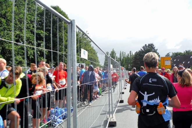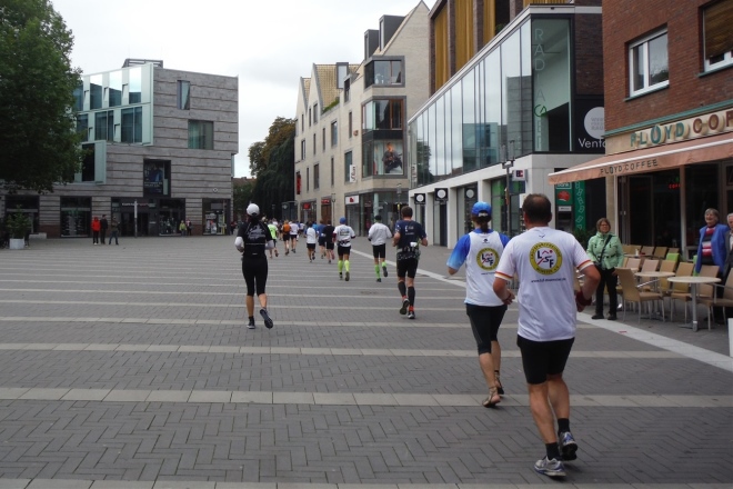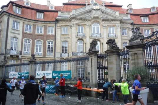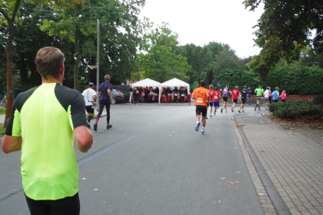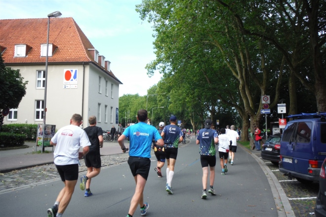 Über die Aegidistraße führt die Strecke jetzt Richtung Aasee. Am Aegiditor warten bereits die Staffelläufer zur ersten Übergabe. Ich lasse mich nicht irritieren, schließlich werde ich vorbildlich rechts an der Wechselzone vorbeigeleitet. Den Weg kenne ich noch von heute Morgen, führt er mich doch direkt zur Jugendherberge. Bevor ich sie erreiche, führt mich eine schmale Gasse bei KM 11 links ab in Richtung Scharnhorststraße. Unter den Anfeuerungsrufen vonSilke und Nikita biege ich ein. Das Läuferfeld ist mittlerweile so weit auseinandergezogen, daß dieses kleine Nadelöhr trotz mittlerweile überholenden Staffelläufern keinen Stau verursacht.
