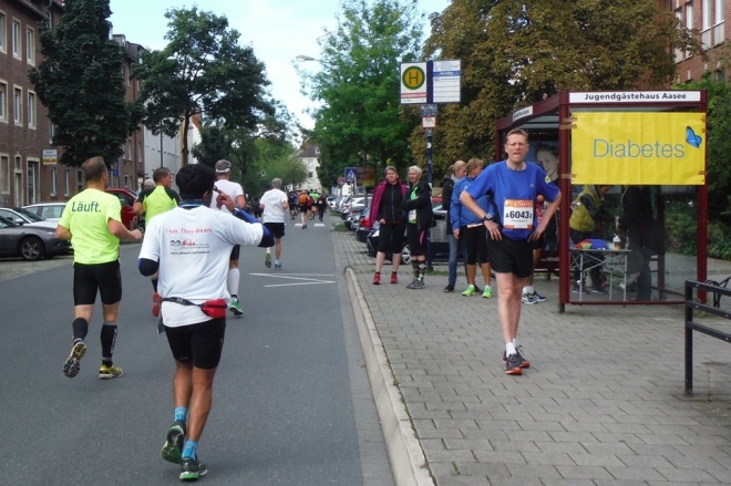 Wie war das nochmal mit dem Blick? Den Aasee verliere ich hier für ein paar hundert Meter aus den Augen. Dafür fällt mir ein Stand für Diabetiker auf, der bei diesem Marathon betroffenen Läuferinnen und Läufern die Gelegenheit zur Überprüfung ihres Blutzuckerspiegels bietet. Vorbidlicher Service, auf den ich glücklicherweise nicht angewiesen bin. Ich kann mein gleichmäßiges Tempo ohne Unterbrechung fortsetzen und überquere bei KM 12 bereits den Aasee. Über die Wasserfläche grüßt von Norden die Überwasserkirche.