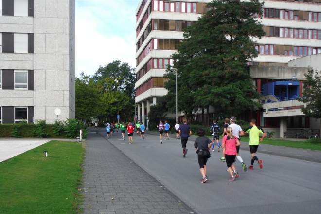 Gemütlich biege ich nach links ab, um Gievenbeck noch einmal zu durchlaufen. Wie bereits im Kreuzviertel erwartet mich gefällige Architektur, nur deutlich moderner. Gievenbeck ist gerade in den letzten Jahren ein beliebter Wohnort für junge Familien geworden. Davon zeugt der grüne Neubau des Steingymnasiums. Früher war es in der Nähe des Schloßplatzes und bei den ersten Marathonläufen in Münster Ort der Startnummernausgabe. Das dynamische junge Publikum hält mich in Schwung.