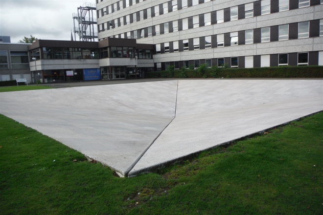 Die folgenden Kilometer führen mich noch über das Gebiet der ehemaligen Gemeinde Überwasser, die 1875 nach Münster eingemeindet wurde. Und ja, die Überwasserkirche gehörte dazu, auch wenn sie nie auf dem Gemeindegebiet lag. Dafür gab es hier viele Wiesen und Felder. Heute allerdings nicht mehr, denn der Platz wurde unter anderem für notwendige Uni-Erweiterungen genutzt. So passiere ich bei etwa KM 16 das naturwissenschaftliche Zentrum. Links glänzt das Kunstwerk „Square Depression“ in der Sonne. Aufdringlich wirkt es aber nicht, da es wie eine auf dem Kopf stehende Pyramide in den Boden gebaut ist. Auch dieses wurde im Rahmen des Kulturprojektes skulpturen errichtet. Dieses alle 10 Jahre in Münster stattfindende Event gibt Künstlern die Gelegenheit, den öffentlichen Raum zu gestalten. Einige bleiben dann dauerhaft erhalten und bereichern das Stadtbild.