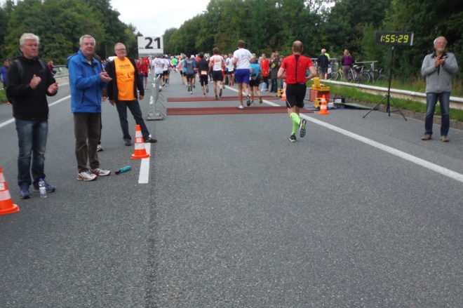 Und wieder bin ich aufgefallen. Schon zum zweiten Mal wird mir angeboten, mich fotografieren zu lassen. Diesmal von Daniel, der auch seinen Einstand auf der Marathonstrecke gibt. Da wir derzeit gleich schnell unterwegs sind, nutze ich die Gelegenheit zu einem angenehmen Plausch. Bei so angenehmer Unterhaltung merke ich die nächsten Kilometer kaum. Auch die Brücke kurz vor KM 20 spüre ich kaum. Trotzdem kommt mir die anschließende Verpflegungsstation sehr gelegen. Ich nutze die Flüssigkeitsaufnahme, um ein paar Meter gehend zu entspannen.