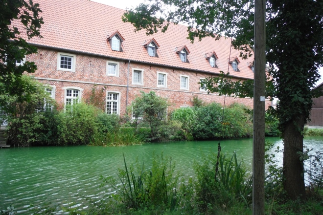 Kulturelle Highlights gibt es auf diesem Abschnitt natürlich wenig. Nur Haus Vögeding bildet da eine Ausnahme. Bei KM 25 ist es erreicht. Ursprünglich lag diese Anlage auf einigen Inseln. Davon ist heute allerdings nicht mehr viel zu erkennen, nachdem in den 50er-Jahren des vorigen Jahrhunderts die Gräfte zum größten Teil verfüllt wurden. Das übrig gebliebene Nass interessiert mich wenig, denn zum Trinken eignet es sich nicht, schon eher das Angebot der hier eingerichteten Verpflegungsstation. Das gibt neue Kräfte für die folgenden Kilometer und die brauche ich auch, denn über das flache Land bläst mir jetzt ein kräftiger Wind entgegen.