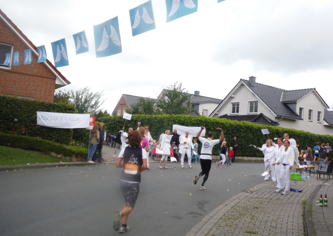 Habe ich tatächlich bereits 33 KM hinter mir? Meine Beine beantworten mir diese Frage eindeutig mit ja. Vielleicht doch schon übersäuert? Aber für einen 6er Schnitt wird es wohl noch reichen. Obwohl, zahlreiche Grills am Streckenrand sind mittlerweile am Glühen. Ob ich anhalte und nach einem Würstchen frage? Beinahe gebe ich den Gelüsten nach. Dann erwarten mich Engel und verleihen mir Flügel. Gleich werden meine Schritte wieder etwas leichter, auch wenn das Tempo nicht mehr schneller wird. Hauptsache im Tritt bleiben. KM 36,5 liegt hinter mir. Der Powerpoint Gievenbeck sorgt für Stimmung und trägt mich weiter. KM 37 ist erreicht, an der Kaserne verlasse ich Gievenbeck. Aber stimmt es, daß ich für den letzten KM 7 Minuten gebraucht habe? Die geplante Endzeit im Kopf, rechne ich nach. Für sub 4 wird es wohl immer noch reichen. Selbst ein paar Gehschritte sind noch drin. Ein Mitläufer muntert mich auf: Komm mit, ist nicht mehr weit. Weiß ich ja und beginne erneut zu traben.