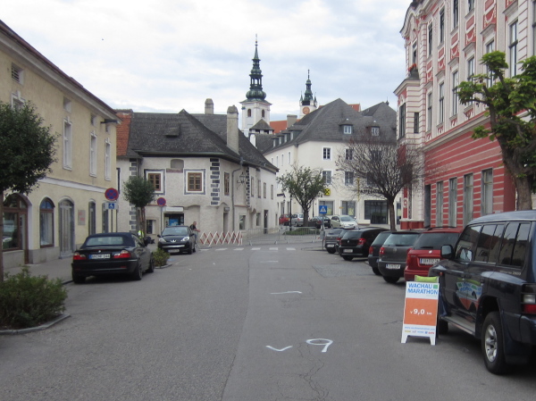 Es sind nur mehr wenige Läufer vor mir zu sehen, auch von hinten kommt kaum mehr jemand nach. Zwei überholen mich bei einer Tafel, die das Ende des Weinbaugebietes Wachau anzeigt, doch nach einigen Hundert Metern gehen sie. Wir sind bereits im Stadtgebiet von Krems, nur mehr 6 km bis in Ziel. Ich rechne: 6:30 min/km x 6 ergibt 39 Minuten Laufzeit, die Uhr zeigt 14.08. Ich müsste also einen Gang zulegen, 4:45 könnten sich noch ausgehen. Ich überhole auf den letzten Kilometern durch die verwinkelte Kremser Altstadt etliche andere Läufer, sprinte beim Zieleinlauf einen Polen nieder, doch am Ende finishe ich mit für mich etwas enttäuschenden 4:51:27. Als ich im Ziel Fotos machen will, funktioniert die Kamera nicht mehr. Der Akku ist erschöpft, immerhin habe ich ca. 270 Schnappschüsse gemacht. Ausgerechnet im Zielbereich streikt die Digicam. Das ärgert mich sehr. Ich nehme mir vor, einen Zweitakku zu kaufen, dann kann ich solche Ausfälle vermeiden.