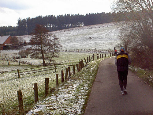 Ein schöner Lauf, viel Sonne, noch viel mehr eiskalter Wind, eine gepuderte Landschaft, schöne Wälder. Länger war ich unterwegs als bei meinen sonstigen Marathons, aber trotzdem war es kurzweilig. Es ist einfach angenehm, wenn man gemeinsam läuft, ohne Ambitionen. Auch wenn man nicht unablässig miteinander redet, ist es trotzdem schön, wenn man seine Gedanken mit jemand austauschen kann, der darauf eingeht und vielleicht ähnliches empfindet.