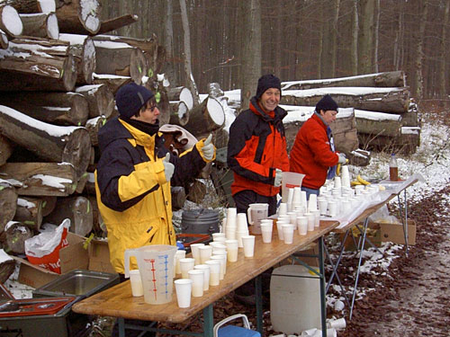 An der nächsten Verpflegungsstelle (km 26) gab es zusätzlich zu den jetzt bereits gut bekannten drei Getränken und Bananen auch noch Kuchenstückchen: Apfelkuchen und Nussecken. Wunderbar, wirklich ein Genuss. Wir vergaßen beinahe den eiskalten Wind, wurden aber beim Weiterlaufen sofort wieder daran erinnert. Endlich! Wir hatten die Schleife hinter uns und waren bald wieder im Wald. Trotzdem dauerte es noch viele Minuten, bis meine Hände wieder einigermaßen beweglich waren und natürlich begegnete uns niemand mehr, waren wir doch schon längst im hinteren 20stel.