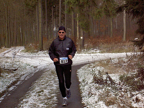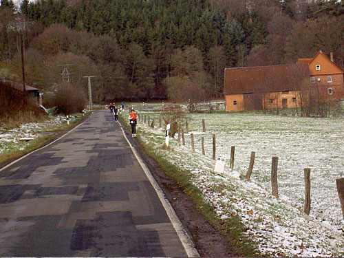 Oben angekommen verließen wir auch bald den Wald und kamen auf freies Feld. Sofort wieder war der unangenehm kalte Wind da. Ich verabschiedete mich von Elisabeth und Klaus und ich zogen ganz langsam davon. Für diese ersten 10 Kilometer haben wir etwas länger als eine Stunde und 11 Minuten gebraucht. Tja, das sollte heute ein schöner, gemütlicher Trainingslauf werden, mehr war wohl für uns beide nicht drin. Was soll man auch gegen Jahresende noch großartige Zeiten laufen. Allerdings habe ich in 14 Tagen noch ein Highlight vor mir, den Untertage Marathon im Salzbergwerk bei Sondershausen und den Tag drauf den 7-Gebirge Marathon. Ich wollte also heute sehen, ob ich mir da nicht zuviel vorgenommen hatte. Seit dem Schwäbisch Alb Marathon vor vier Wochen hatte ich keinen langen Lauf mehr gemacht, nur noch kurze schnelle Läufe, so dass ich froh sein konnte, wenn ich heute gut durchkam.