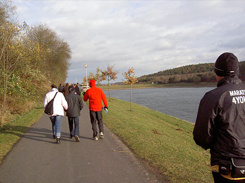 Klaus verstieg sich zu der Aussage, dass das sein unangenehmster Streckenabschnitt aller gelaufenen Marathons des Jahres sei, und Klaus war dieses Jahr immerhin 37 Marathons und Ultras gelaufen. Nützte aber alles nichts, wir mussten den starken, eiskalten Wind ertragen.