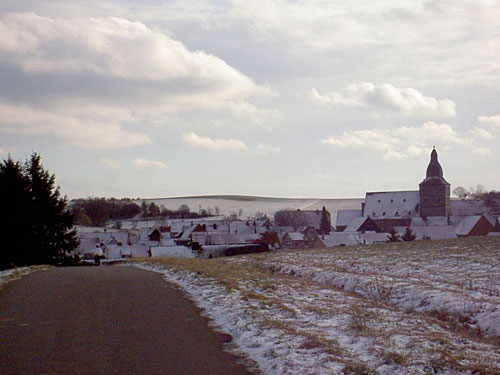 Irgendwann war es auch wieder abwärts gegangen und wir liefen jetzt auf einer Landstraße. Vermutlich war sie nicht gesperrt, aber Autos sah man trotzdem nicht. Schon nach weniger als einem Kilometer ging es rechts weg, die Straße war noch unbedeutender und bald liefen wir wieder abseits auf einer ganz schmalen Asphaltstraße, die wohl nur Zubringer zu den Bauernhöfen der Gegend war und auch diese Straße verließen wir bald und kamen wieder in den Wald.